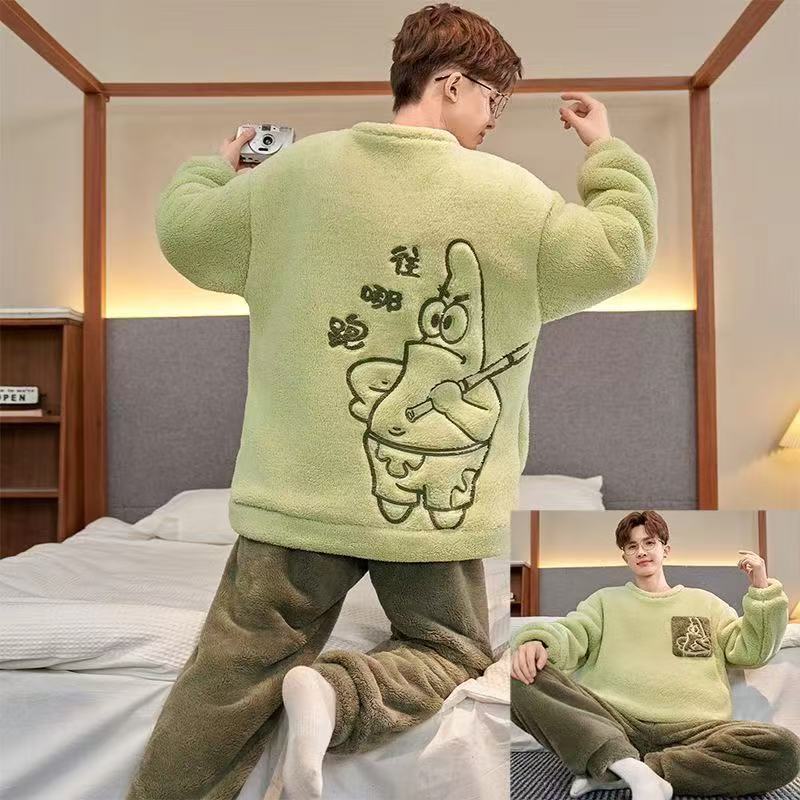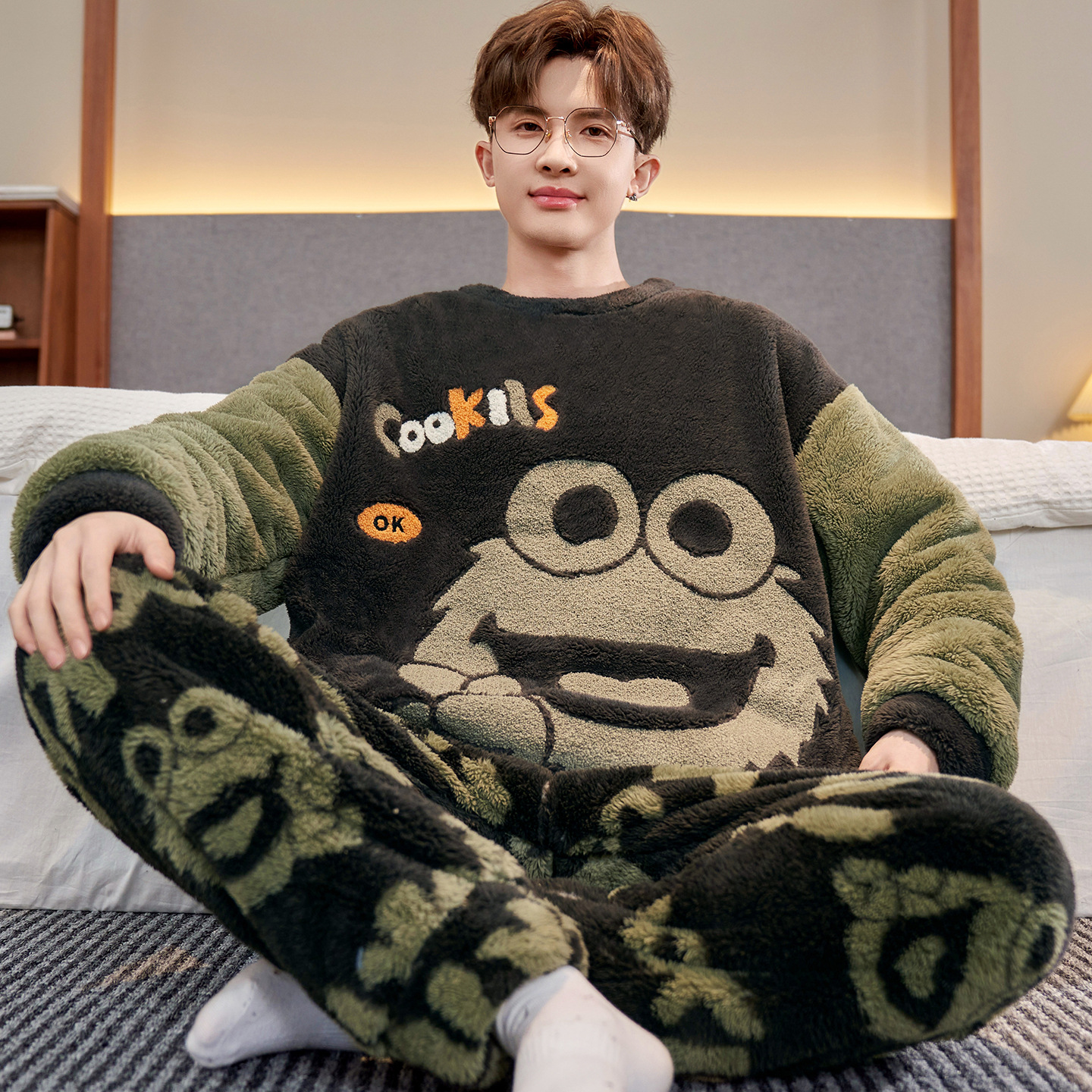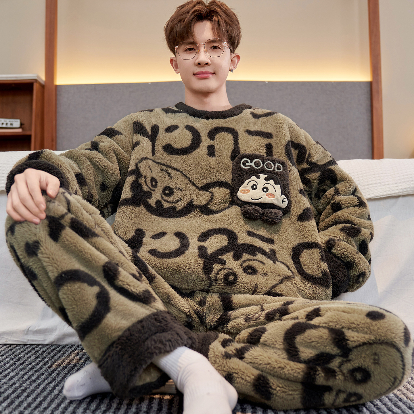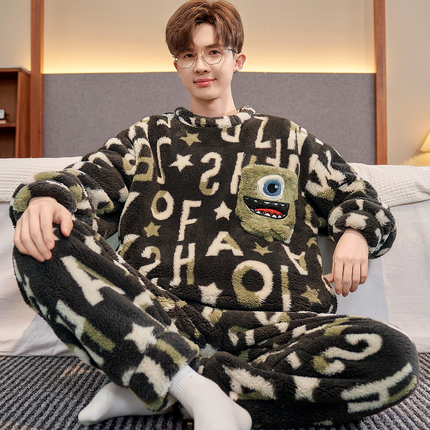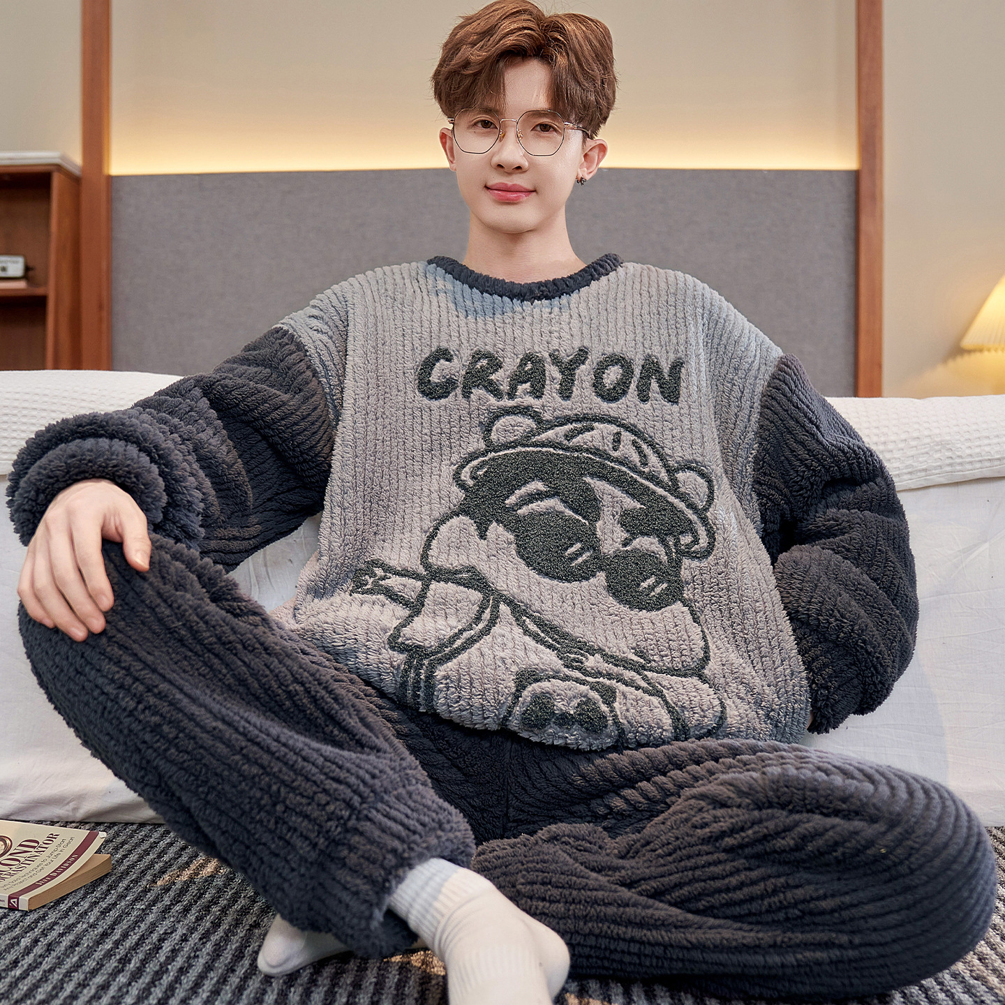 잠옷 남자의 겨울 산호 양털 두꺼운 기모 따뜻한 가정 옷 세트 만화 플란넬 풀오버 남자의 겨울 스타일