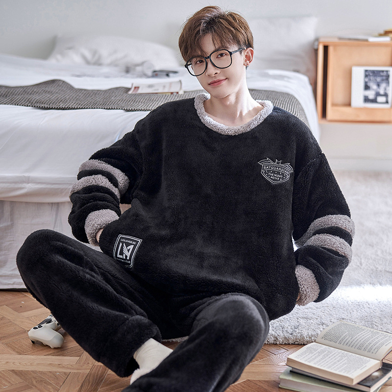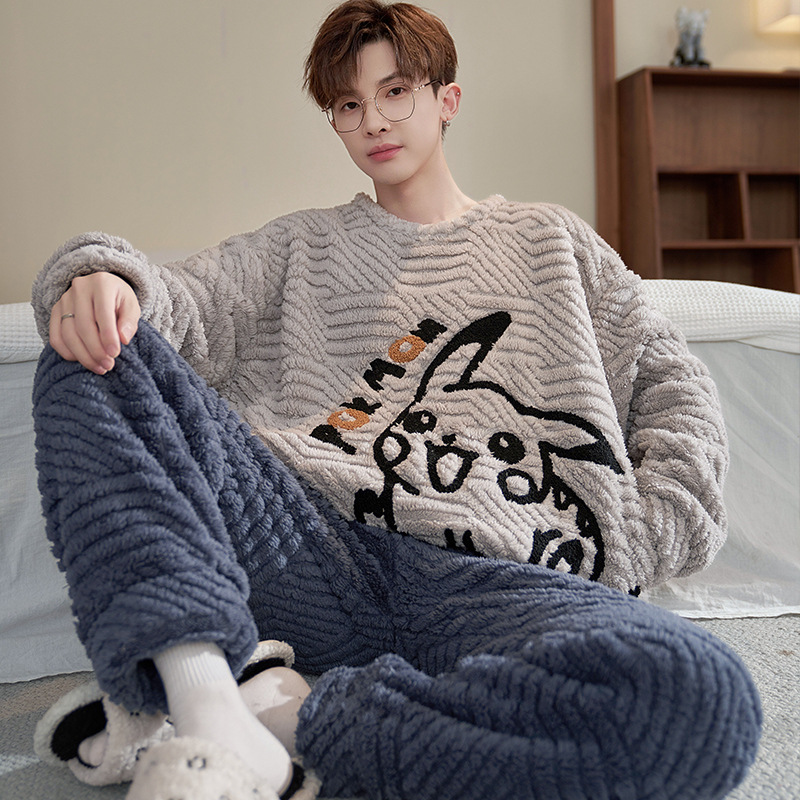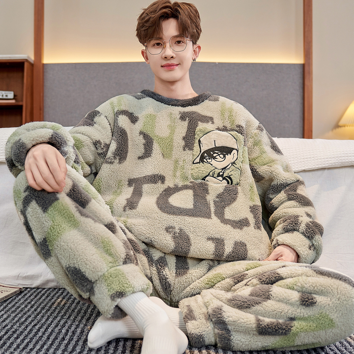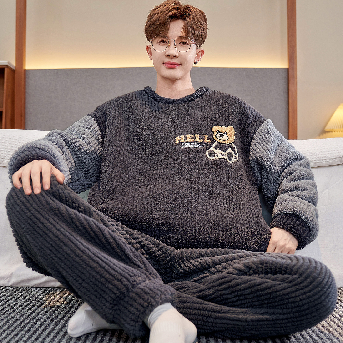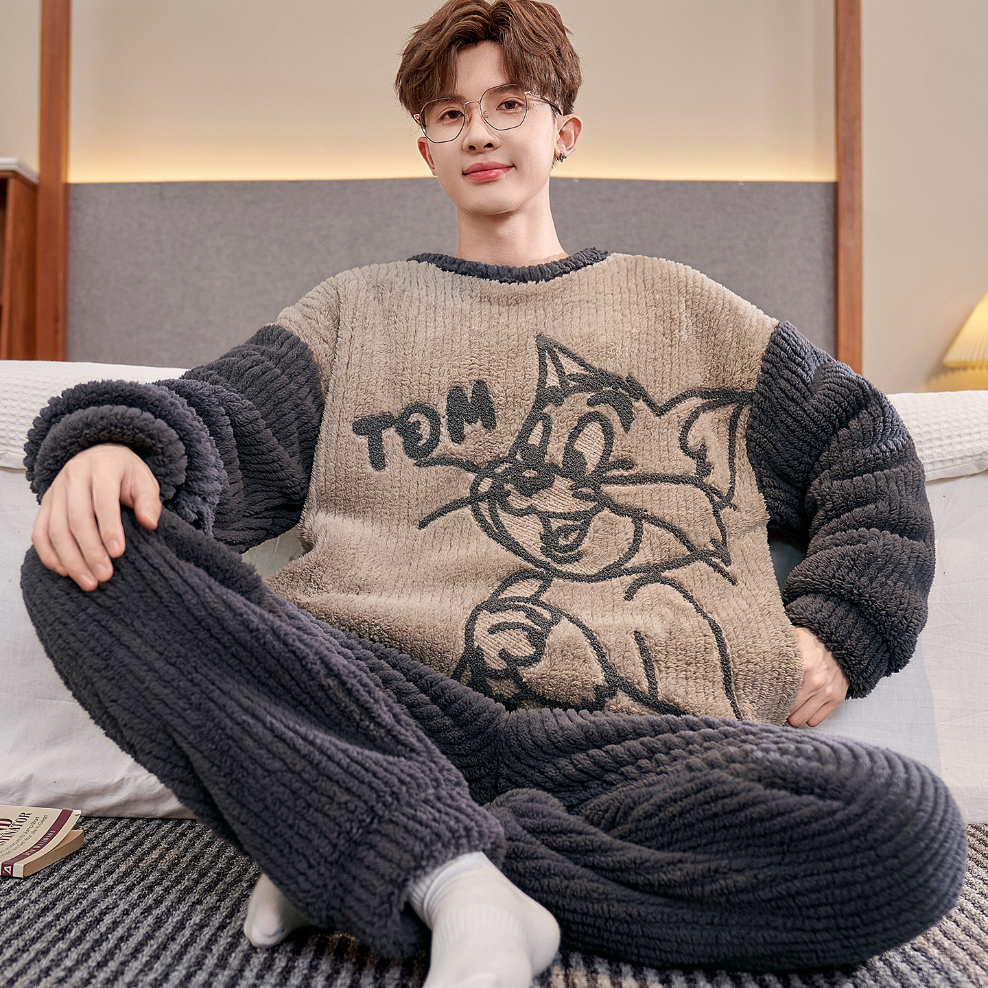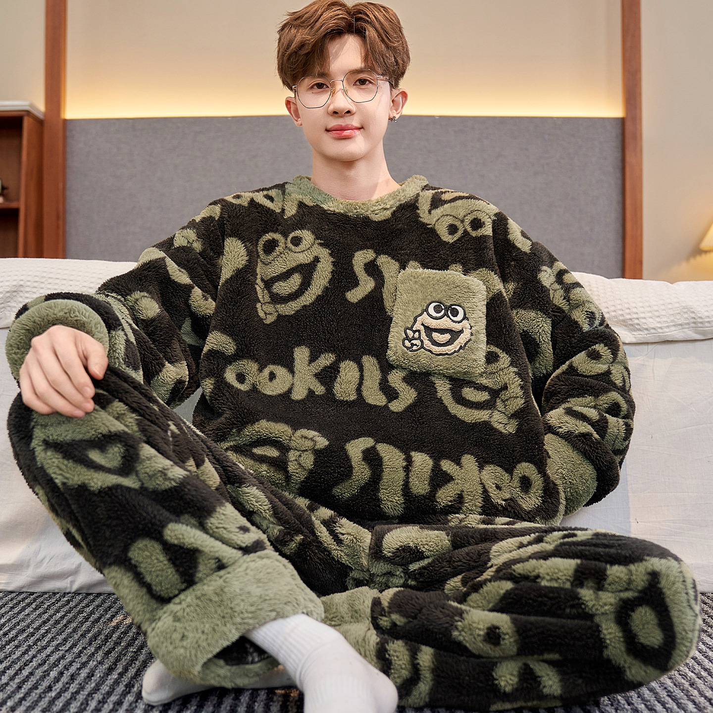잠옷 남자의 겨울 산호 양털 두꺼운 기모 따뜻한 가정 옷 세트 만화 플란넬 풀오버 남자의 겨울 스타일