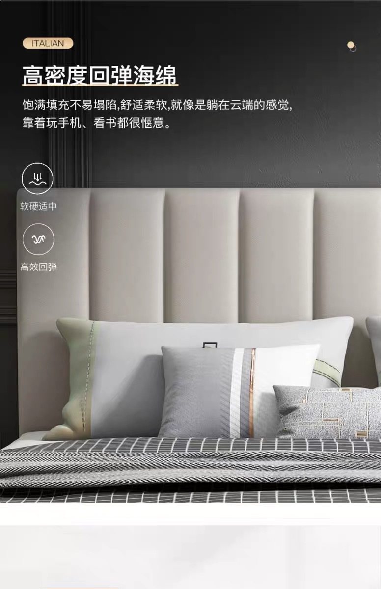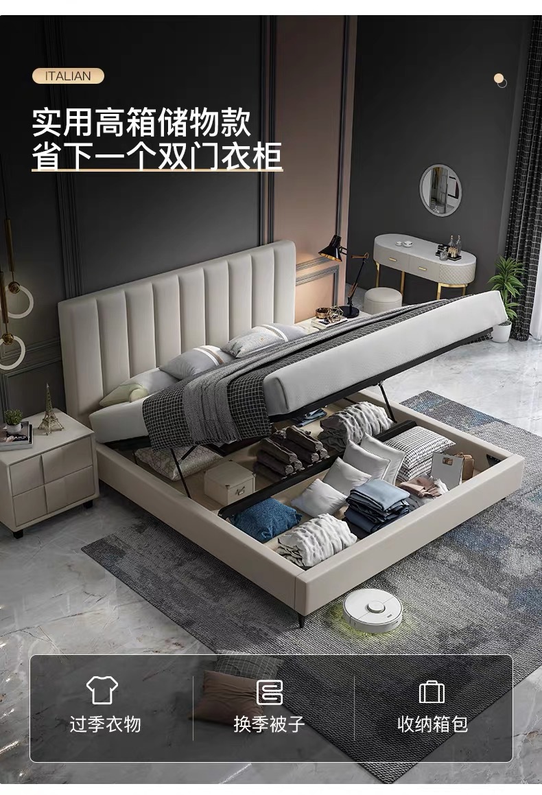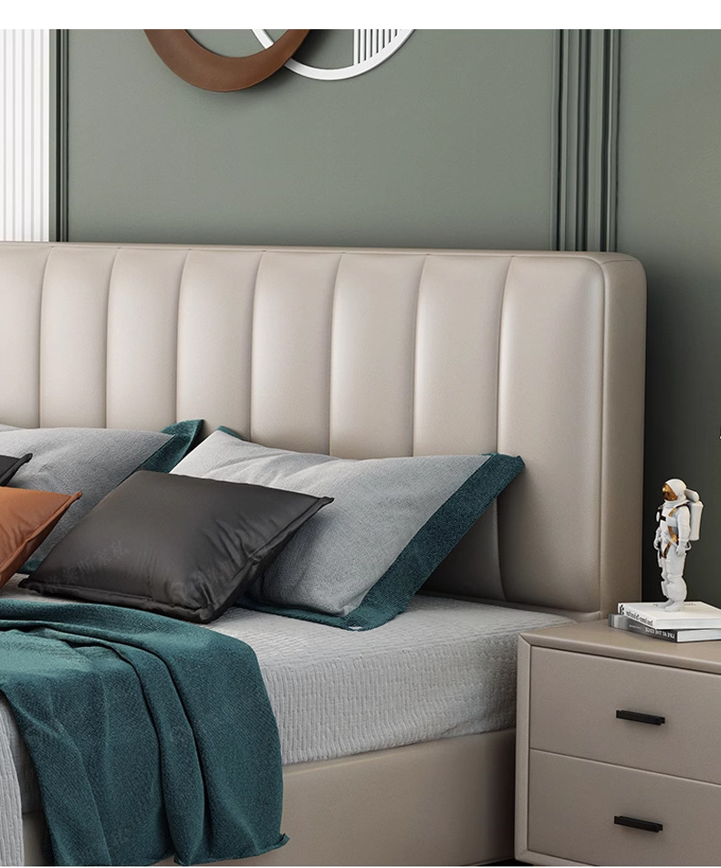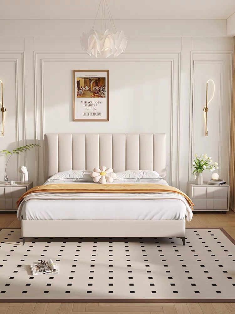 이탈리아 스타일 가죽 침대, 소형 주택용 미니멀리스트 더블 침대, 초박형 침대 헤드보드, 가죽 예술 웨딩 침대, 하이박스 수납