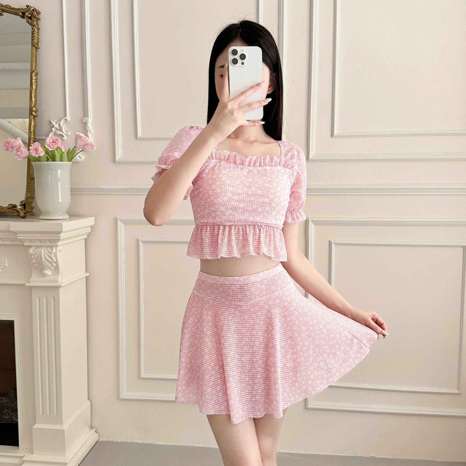 수영복 여성 여름 꽃 신선한 스타일 새로운 온천 비키니 분할 투피스 세트 레이스 업 섹시한 슬림 수영복스토어 가기