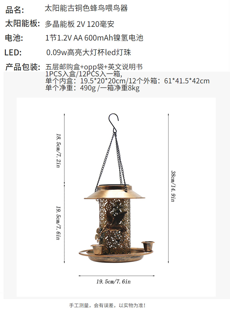 새로운 철 태양 조류 먹이 물 공급 장치 안뜰 교수형 벌새 프로젝션 장식 조명 벌새 먹이 장치스토어 가기