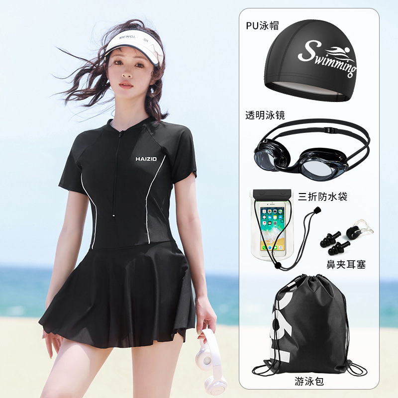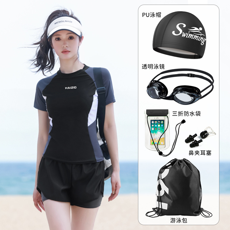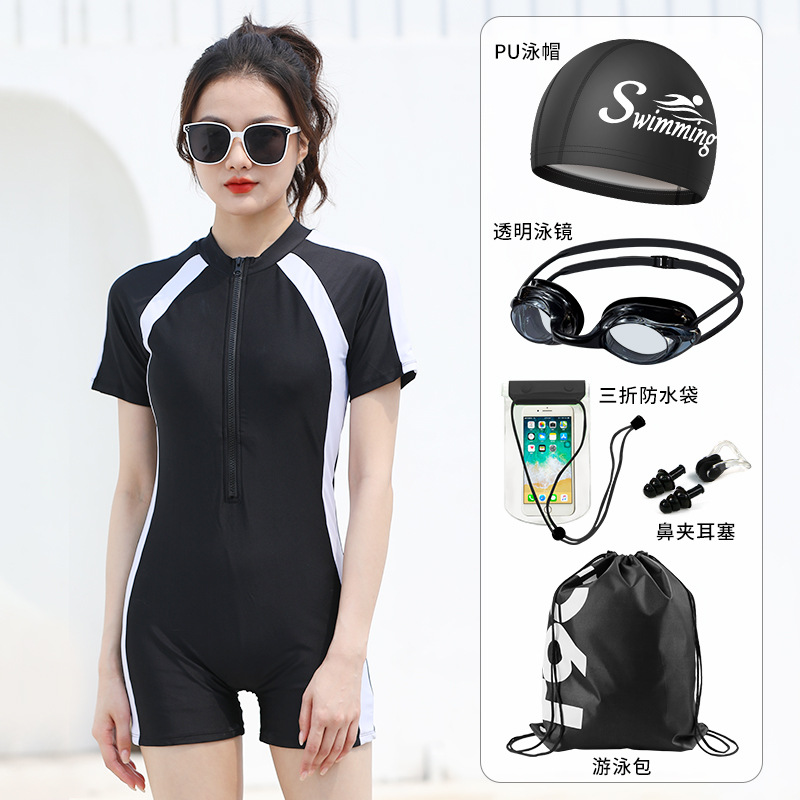 • E60 반팔 수영복 + 605 블랙 + 5088 블랙 + 코 클립 귀마개 블랙 + 70% off 방수 가방 블랙 + T90 흑백