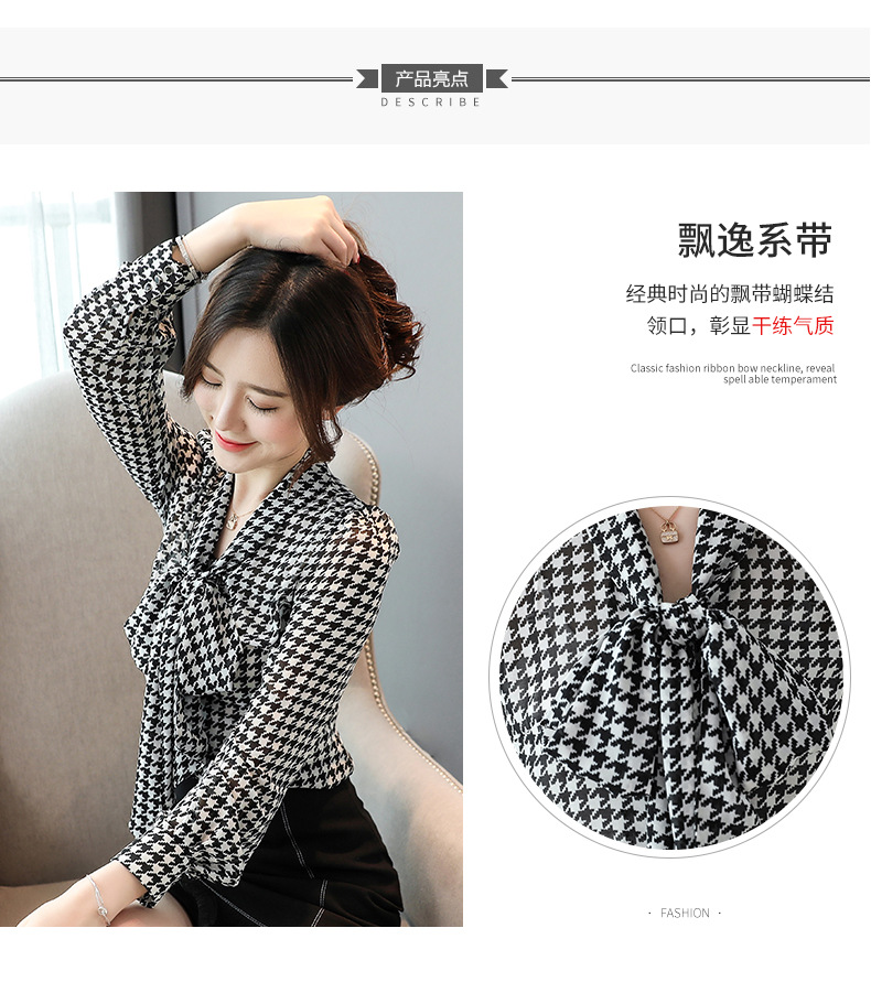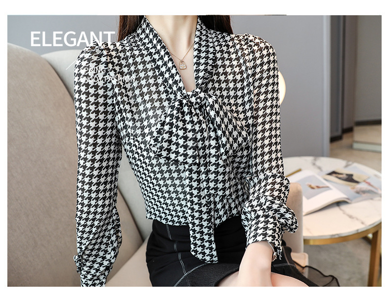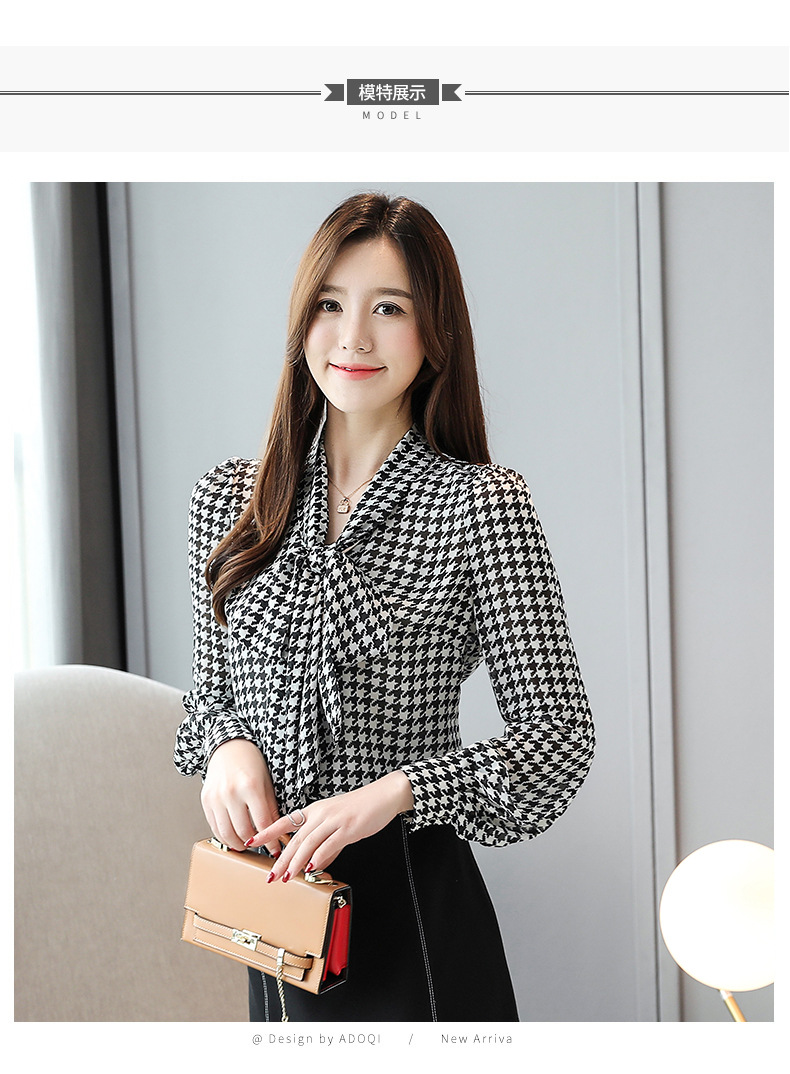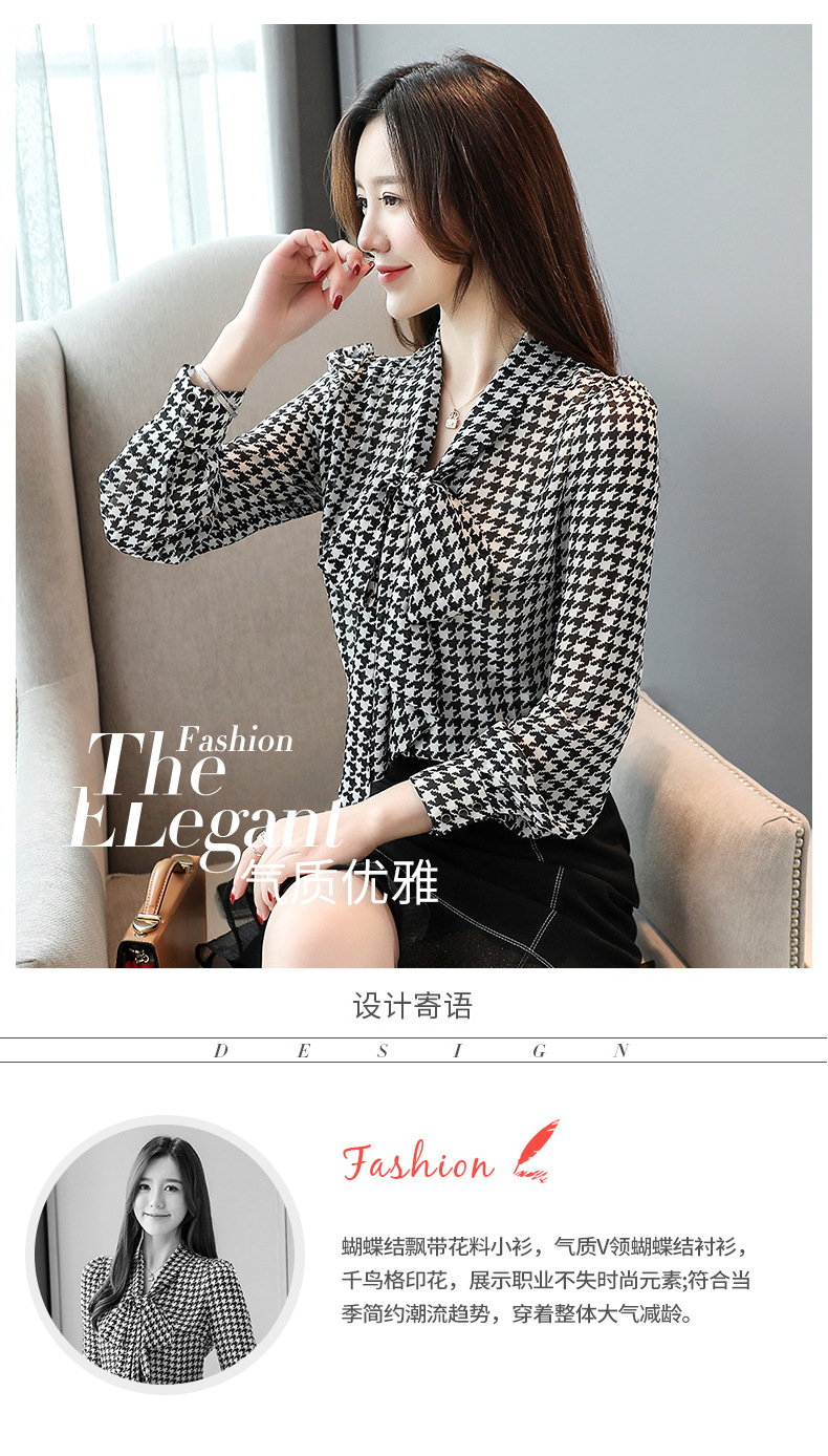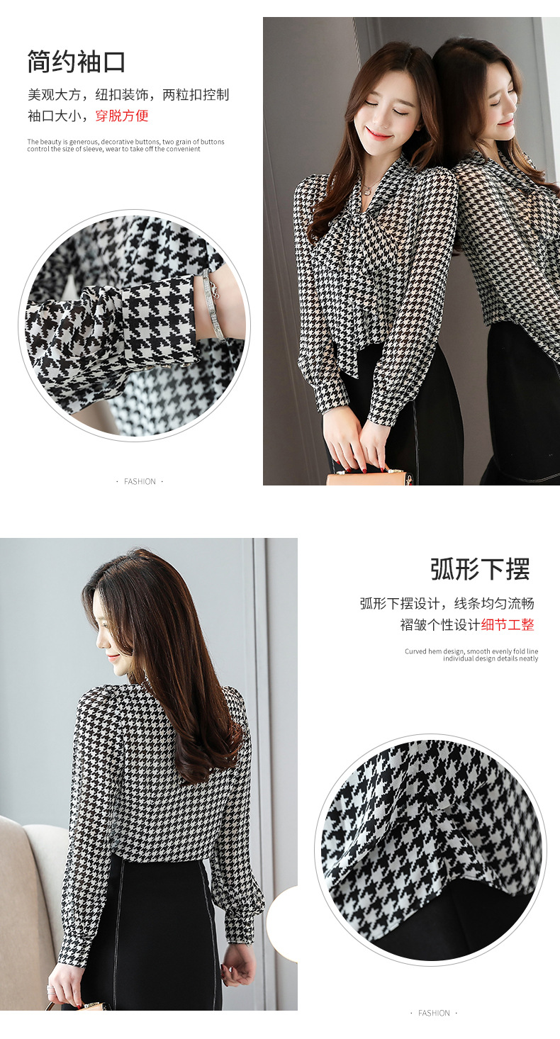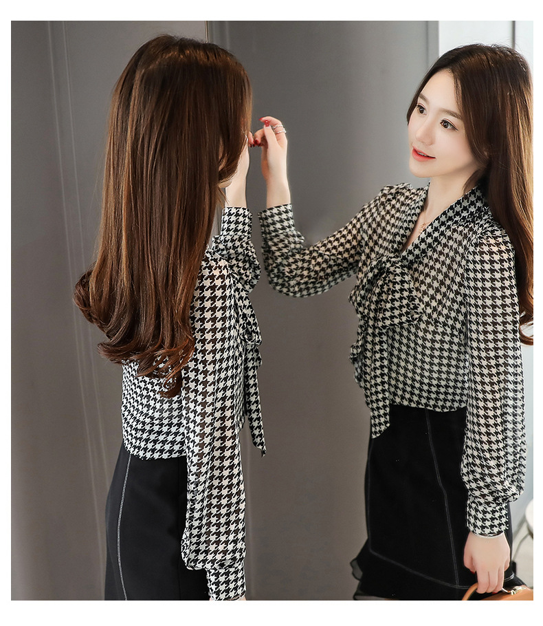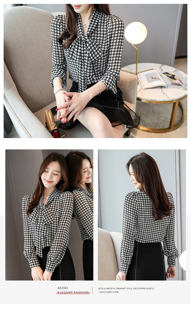 봄과 가을 새로운 여자의 뚱뚱한 자매 플러스 사이즈 나비 넥타이 쉬폰 셔츠 200 진 Qiandao 격자 무늬 셔츠 긴 소매