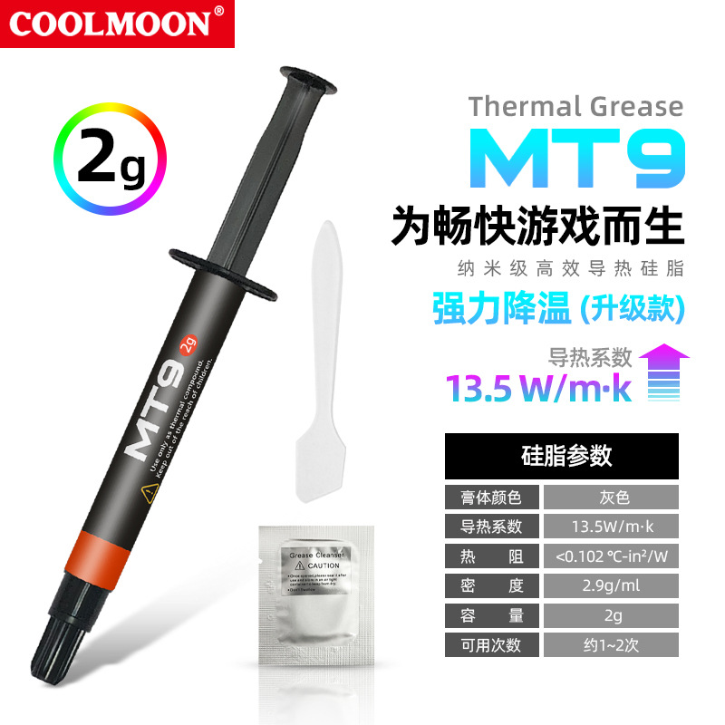 COOLMOON酷月 MT8纳米级高导热率绝缘导热硅脂,导热系数为12.8W/m·k,配硅脂涂抹工具包,高效性能,长久使用,全新升级彩盒包装,硅脂适用于各类场景,运用广泛,工厂直营销售,大量现货供应,支持跨境销售,欢迎采购下单,量大价优,详情请联系客服!