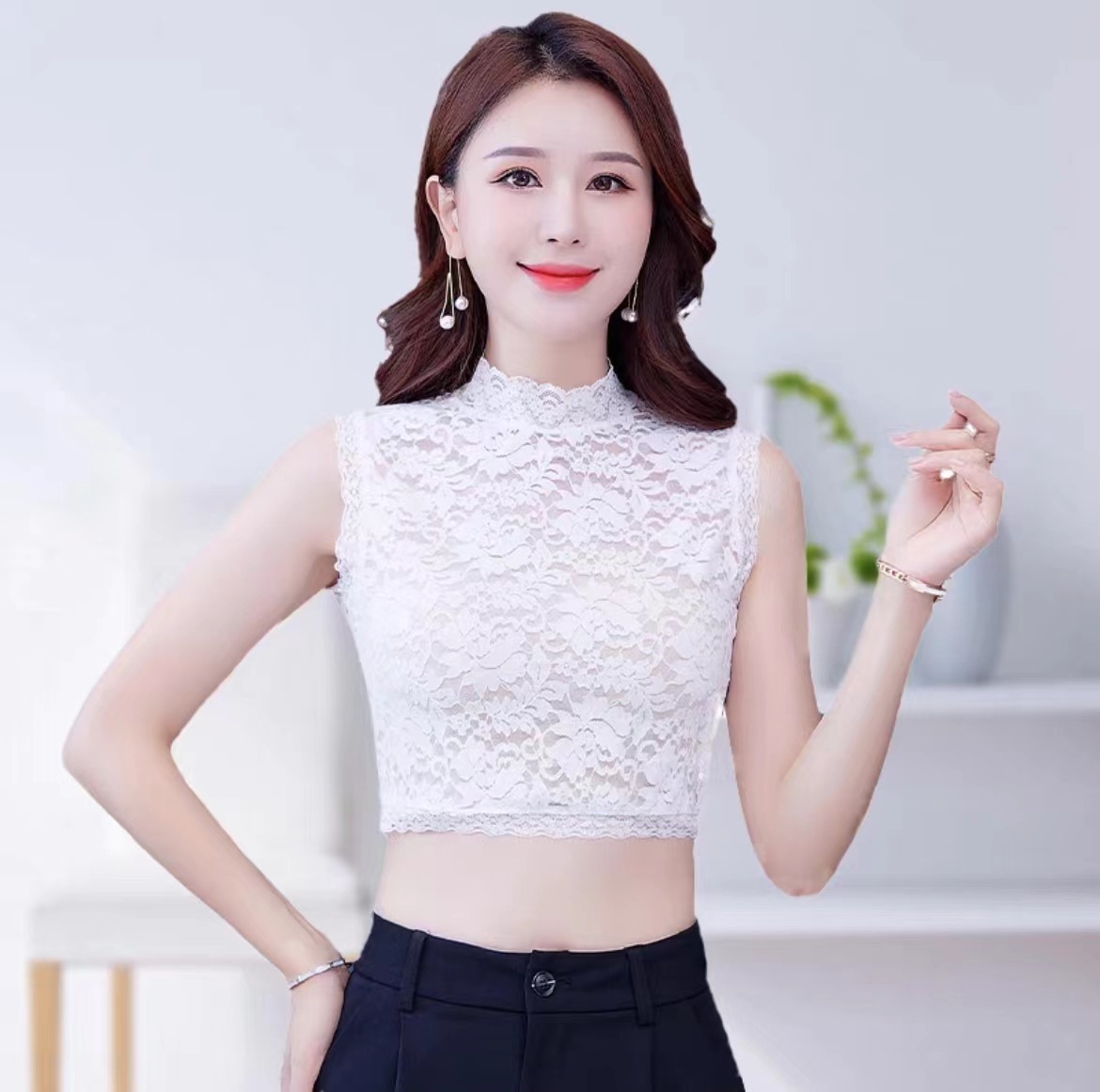 하프 하이 칼라 민소매 레이스 조끼 여성용 여름 섹시한 내부베이스 셔츠 타이트 여성용 메쉬 탑 세로 칼라스토어 가기