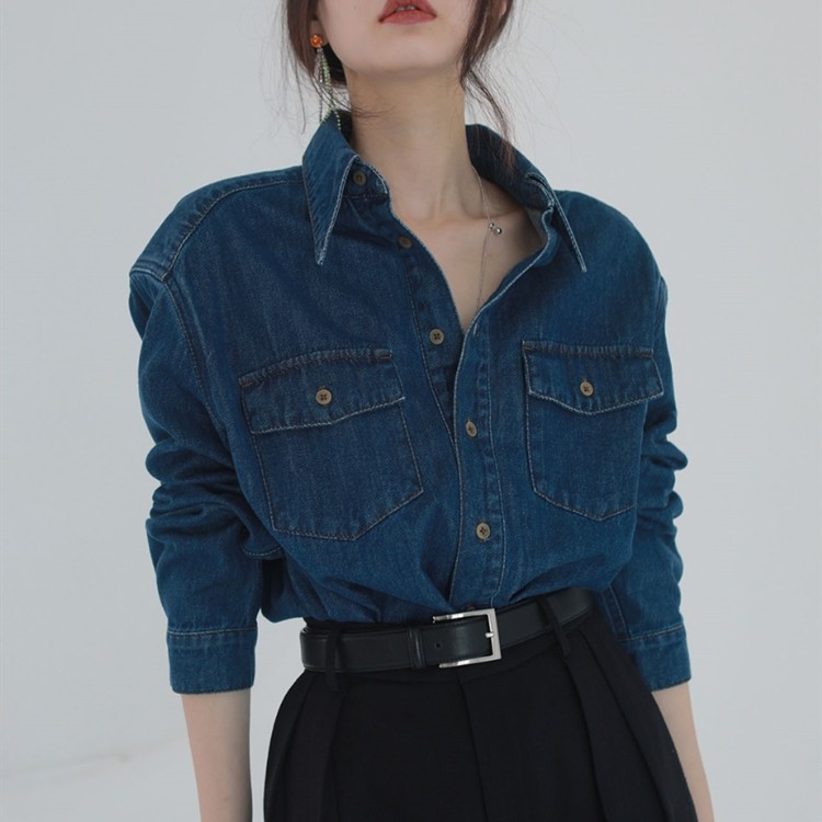 데님 셔츠 여성용 빈티지 워싱 데님 재킷 가을 새로운 한국 스타일 홍콩 스타일 패션 웨스턴 스타일 슬리밍 셔츠스토어 가기