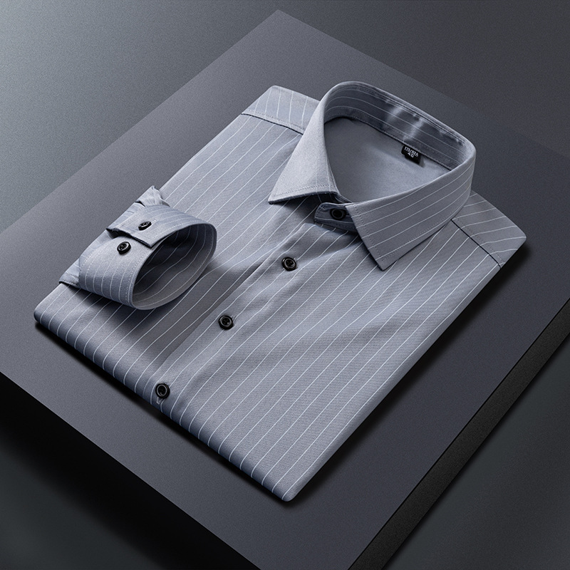 2023 여름 얇은 청소년 비즈니스 스트레치 그레이 스트라이프 슬림핏 한국 스타일 라펠 캐주얼 남성 긴팔 셔츠