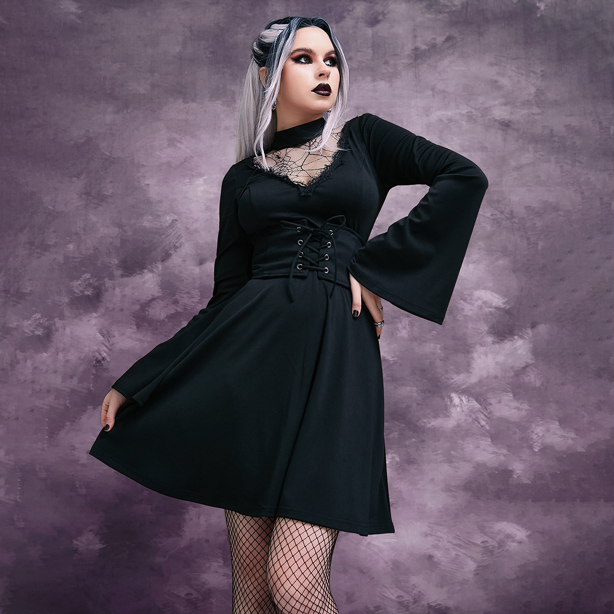 유럽과 미국 다크 레이스 메쉬 긴 소매 원피스 블랙 하이 웨이스트 고딕 스타일 원피스