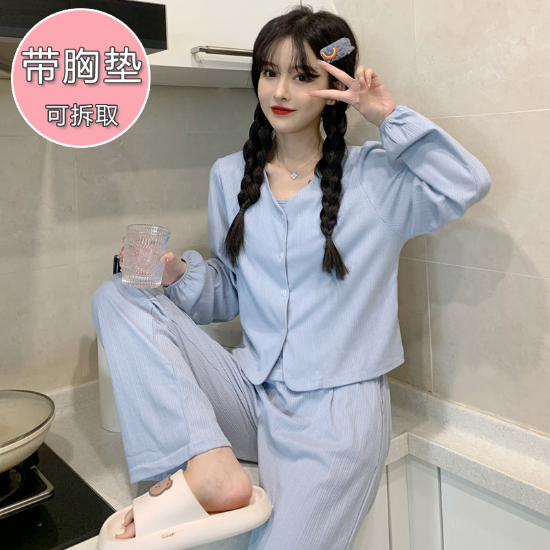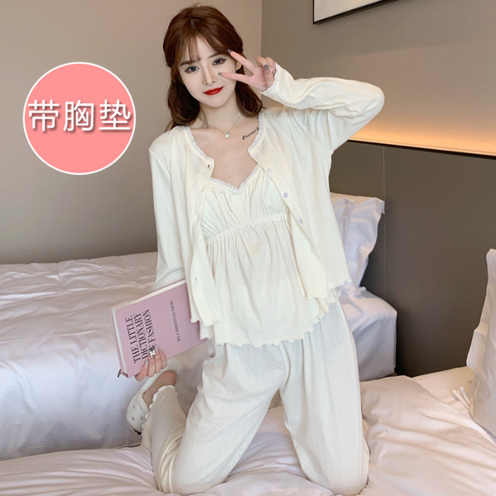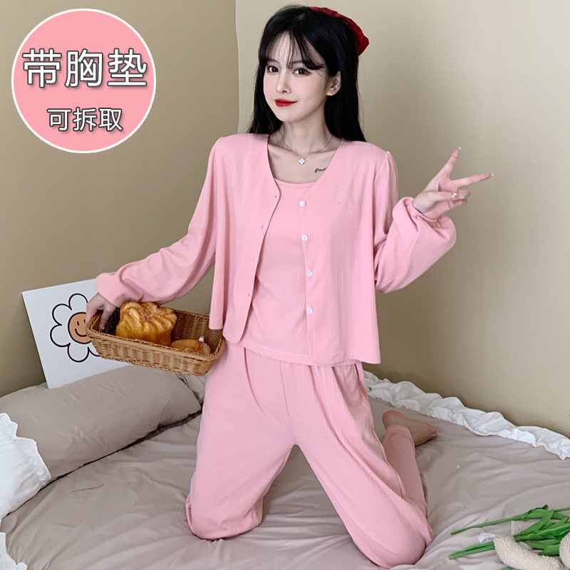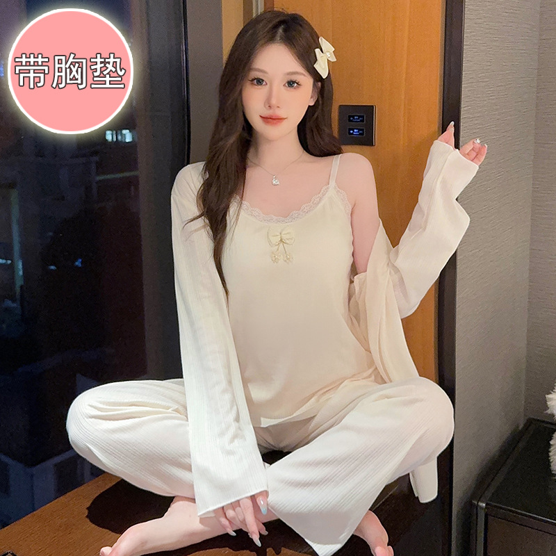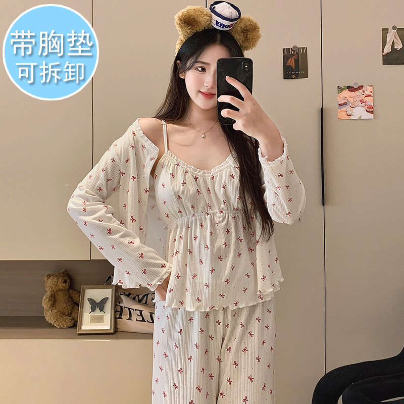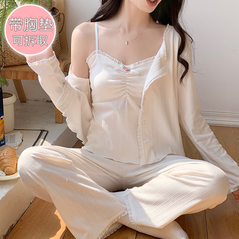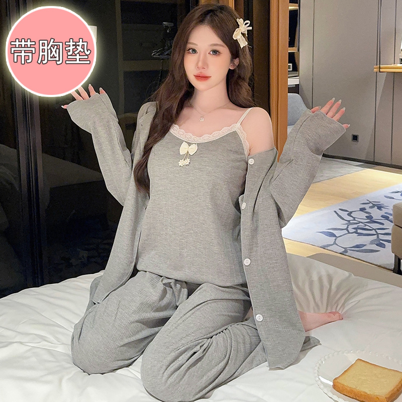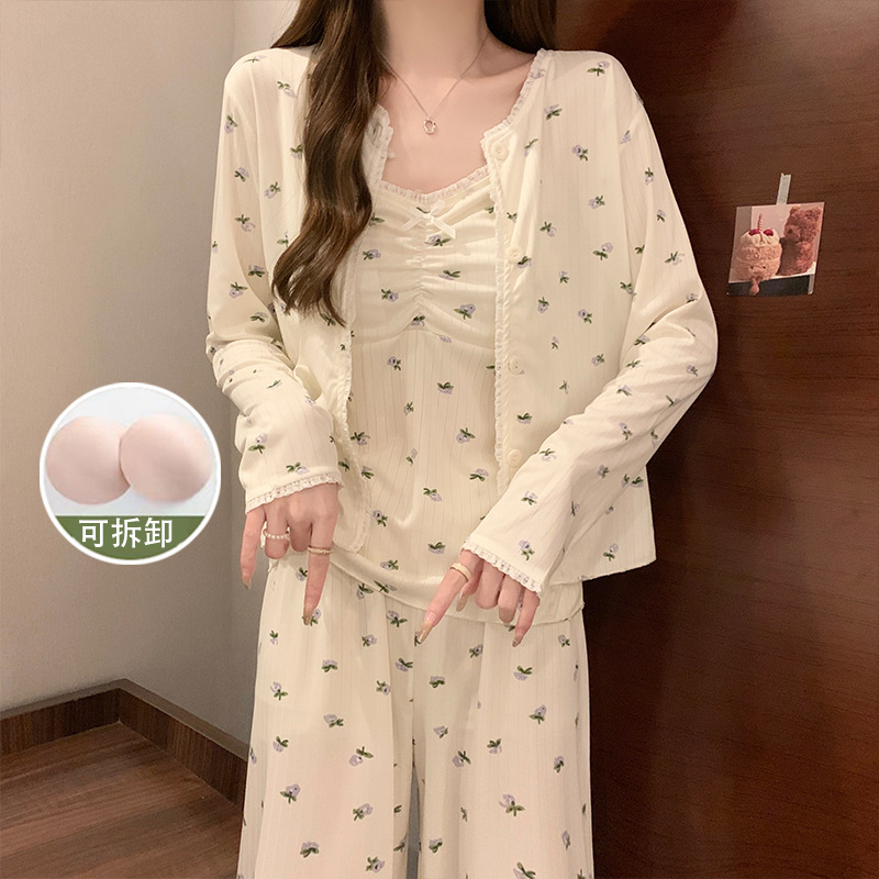 여자 꽃 잠옷 여성의 봄과 여름 새로운 카디건 코튼 긴 소매 가슴 패드 섹시한 가을 3 피스 홈 옷스토어 가기
