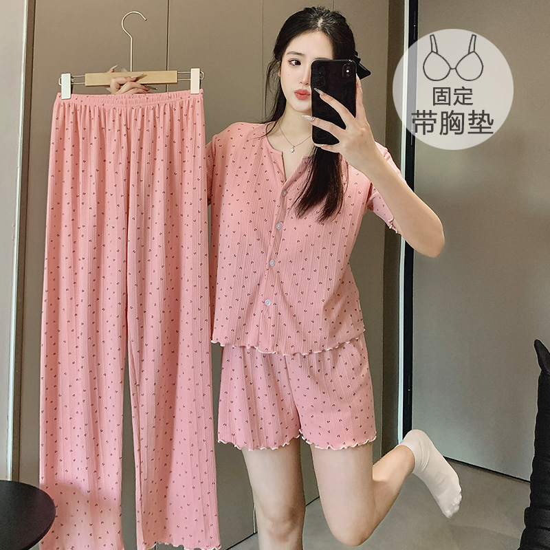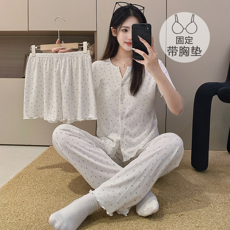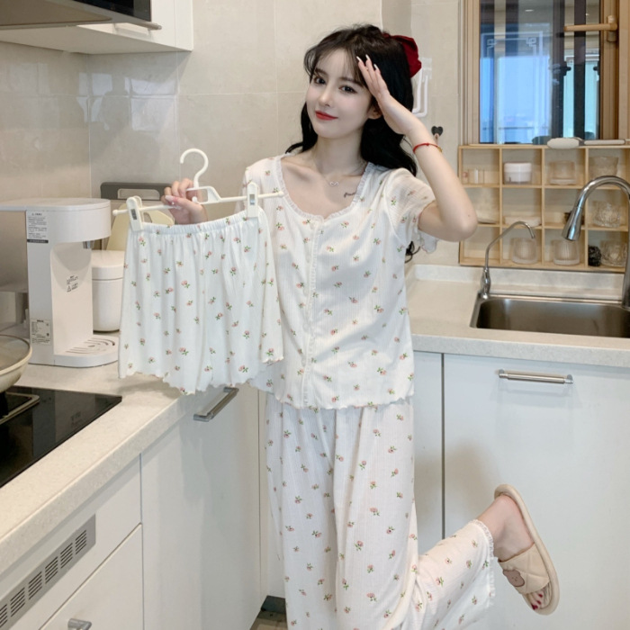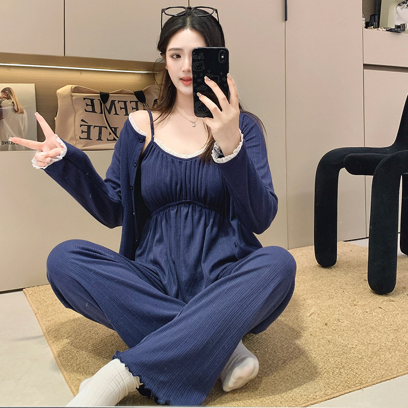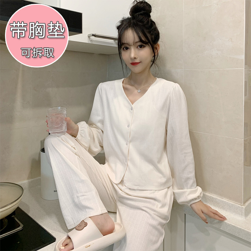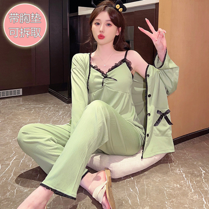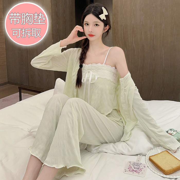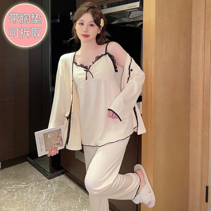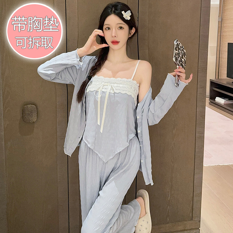 여자 꽃 잠옷 여성의 봄과 여름 새로운 카디건 코튼 긴 소매 가슴 패드 섹시한 가을 3 피스 홈 옷스토어 가기
