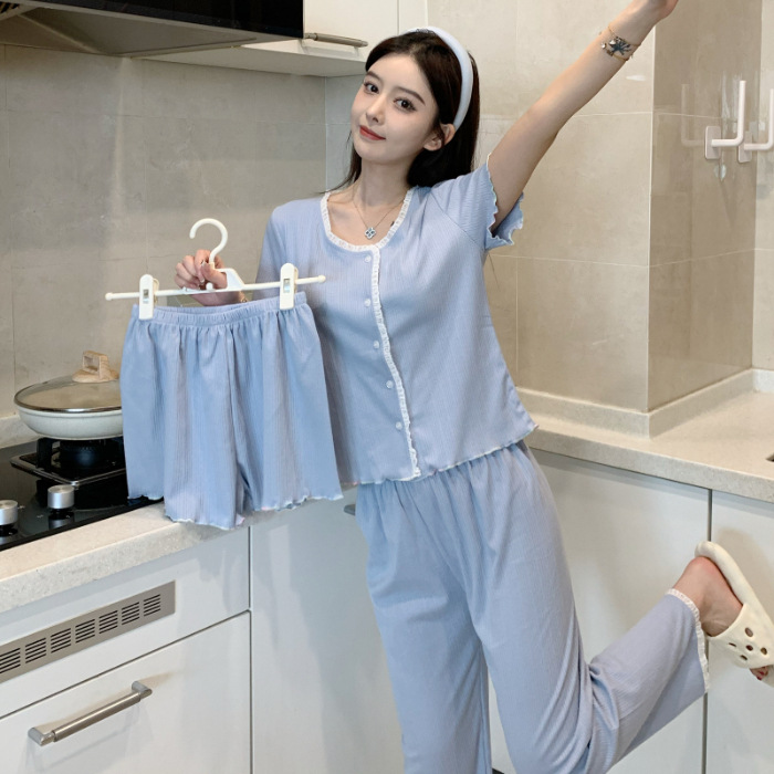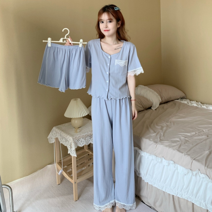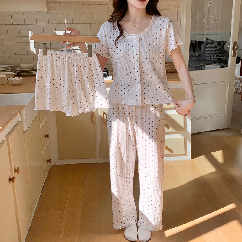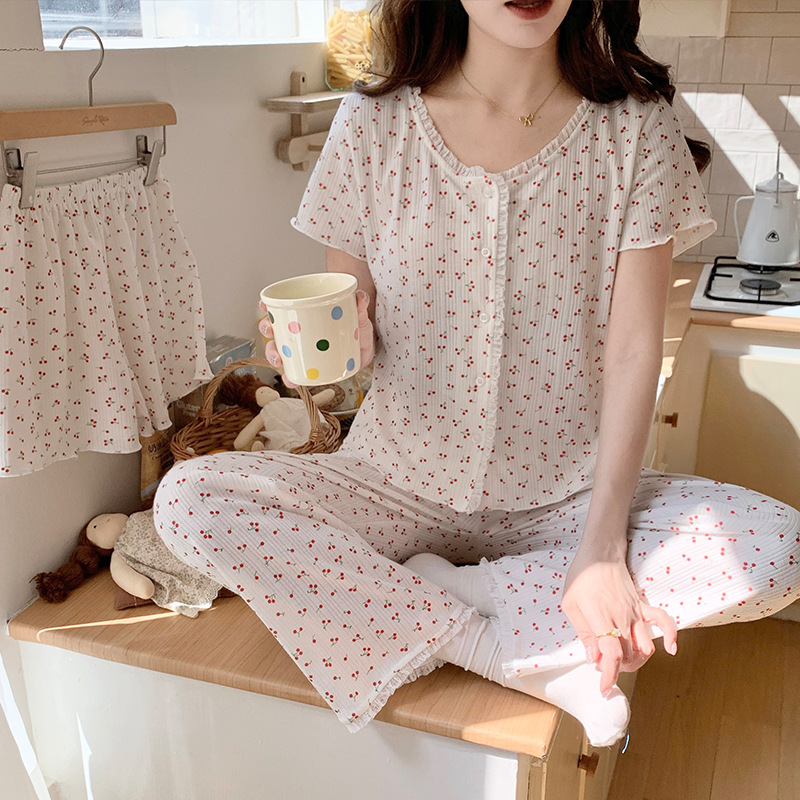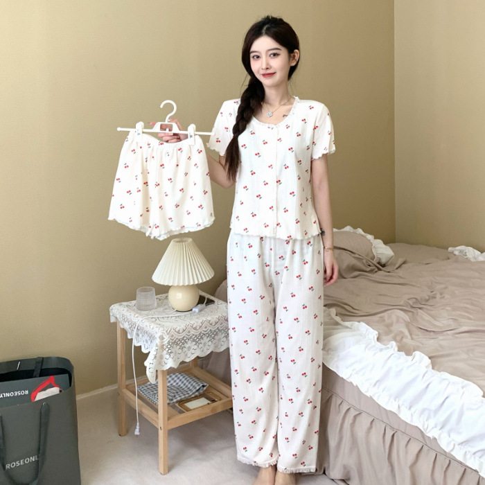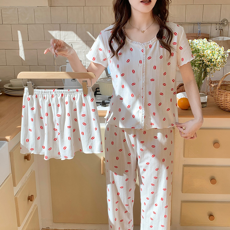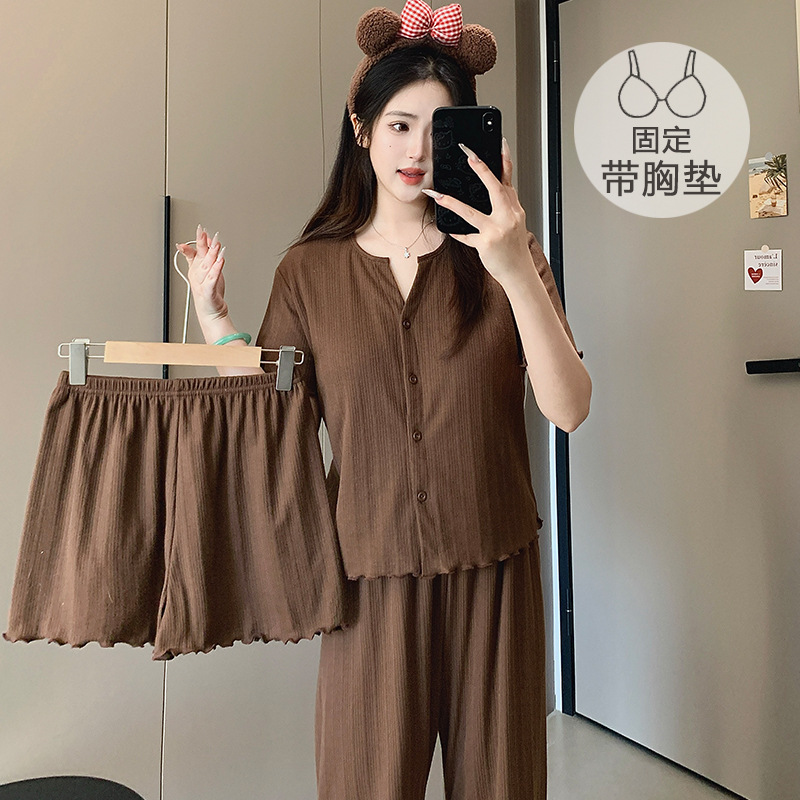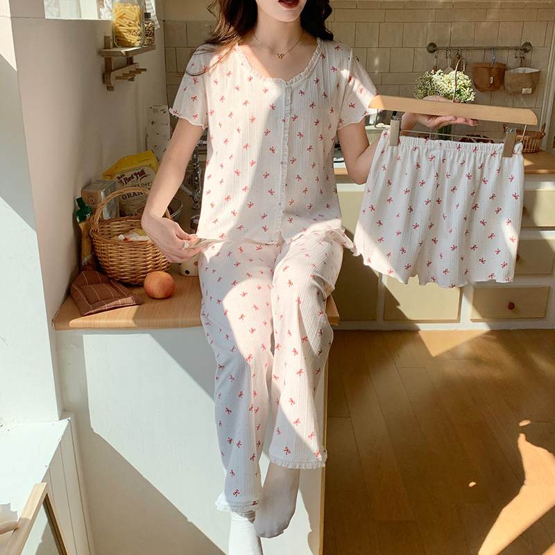 여자 꽃 잠옷 여성의 봄과 여름 새로운 카디건 코튼 긴 소매 가슴 패드 섹시한 가을 3 피스 홈 옷스토어 가기