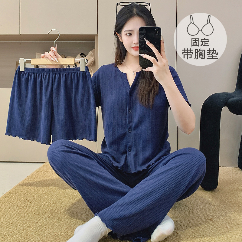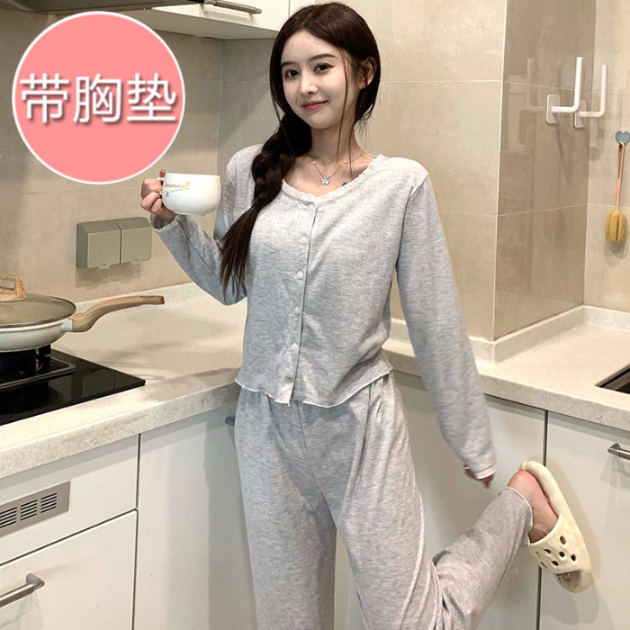 여자 꽃 잠옷 여성의 봄과 여름 새로운 카디건 코튼 긴 소매 가슴 패드 섹시한 가을 3 피스 홈 옷