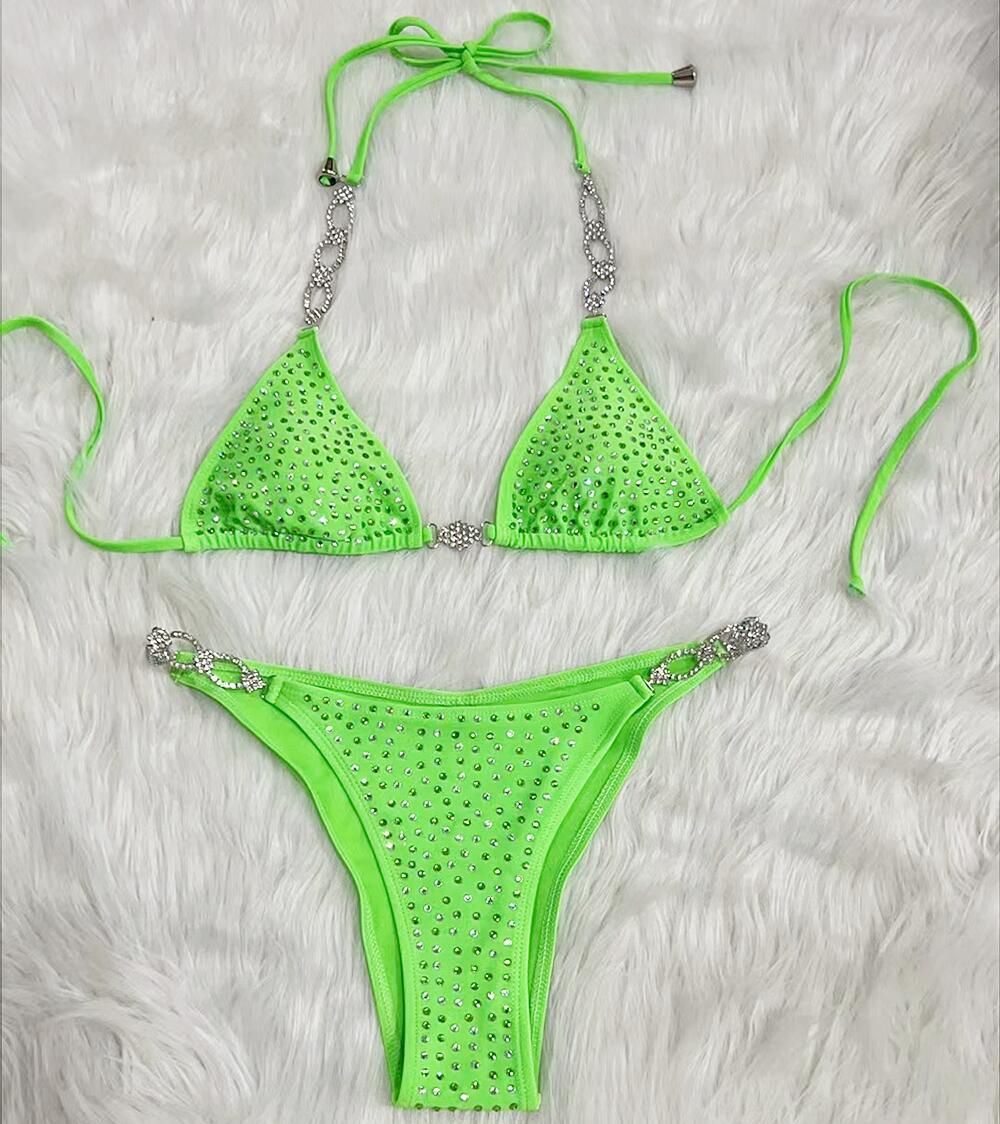 2022跨境新款bikini 欧美性感烫钻分体女泳衣 纯色绑带比基尼批发