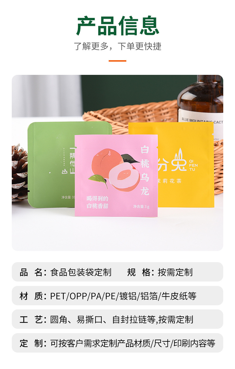 차 포장 백, 맞춤형 컬러 인쇄, 독립 밀봉 소형 티백, 3면 밀봉 너트 식품 알루미늄 호일 지퍼백