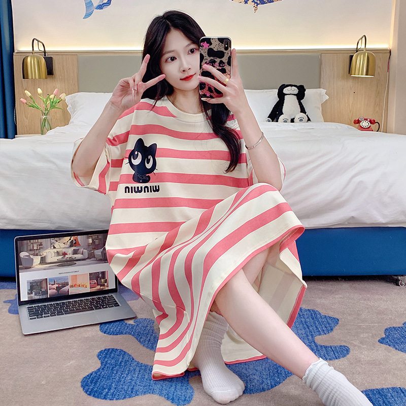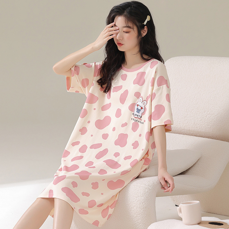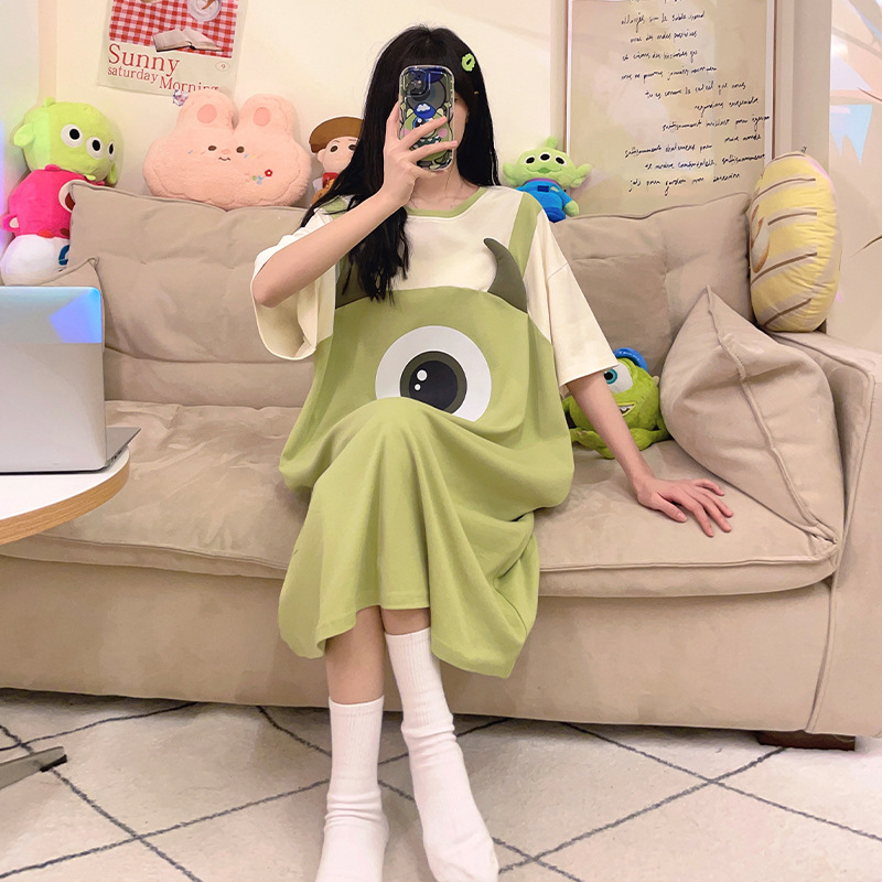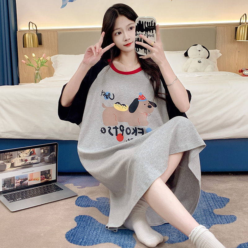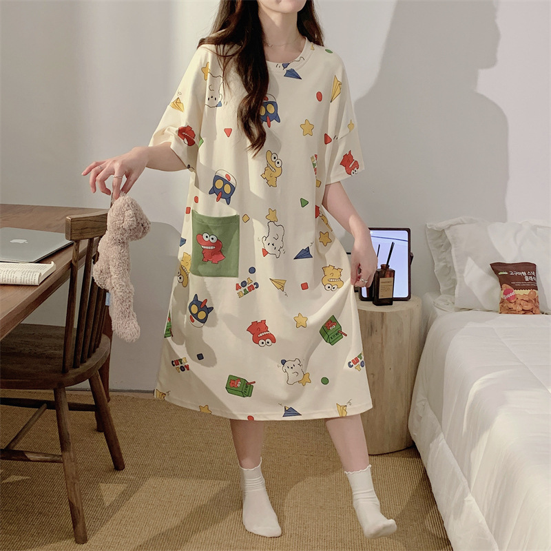 여름 새 여성 잠옷, 귀여운 반팔 잠옷, 만화 대형 여름 얇은 롱 스커트, 집 옷, 야외에서 착용 가능