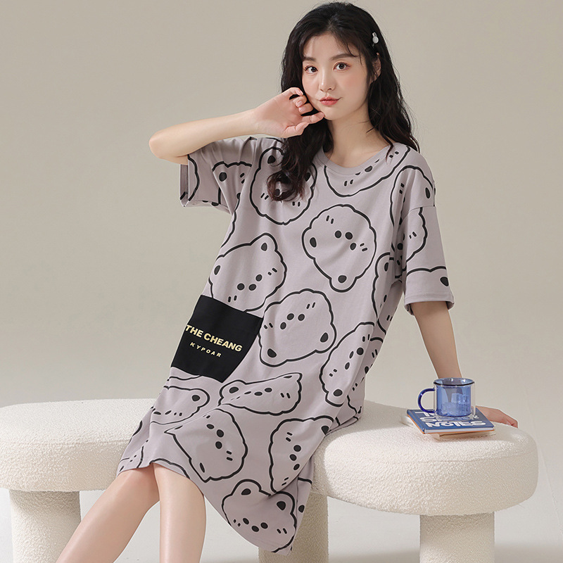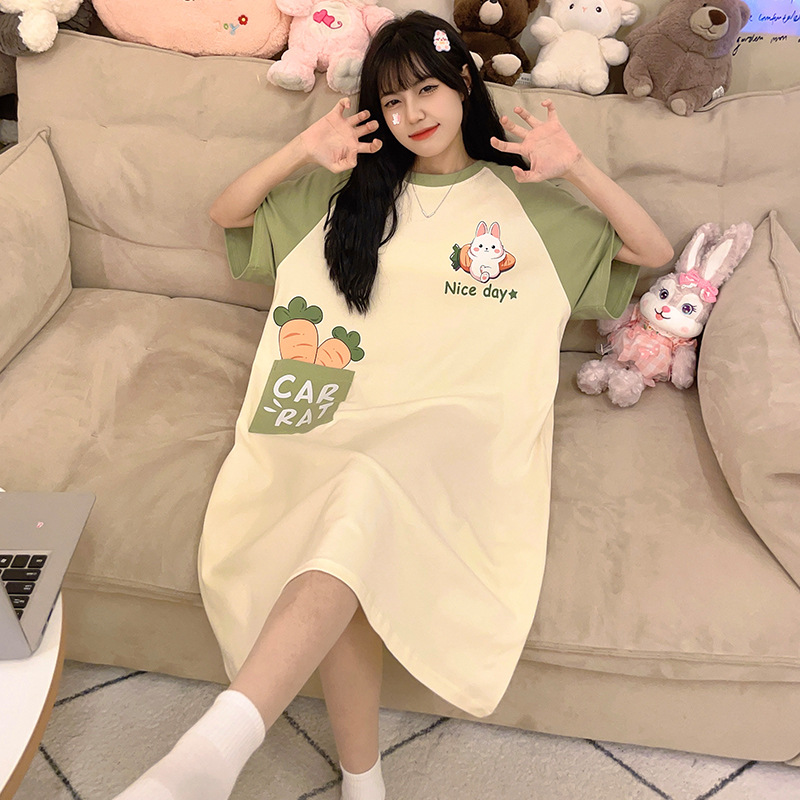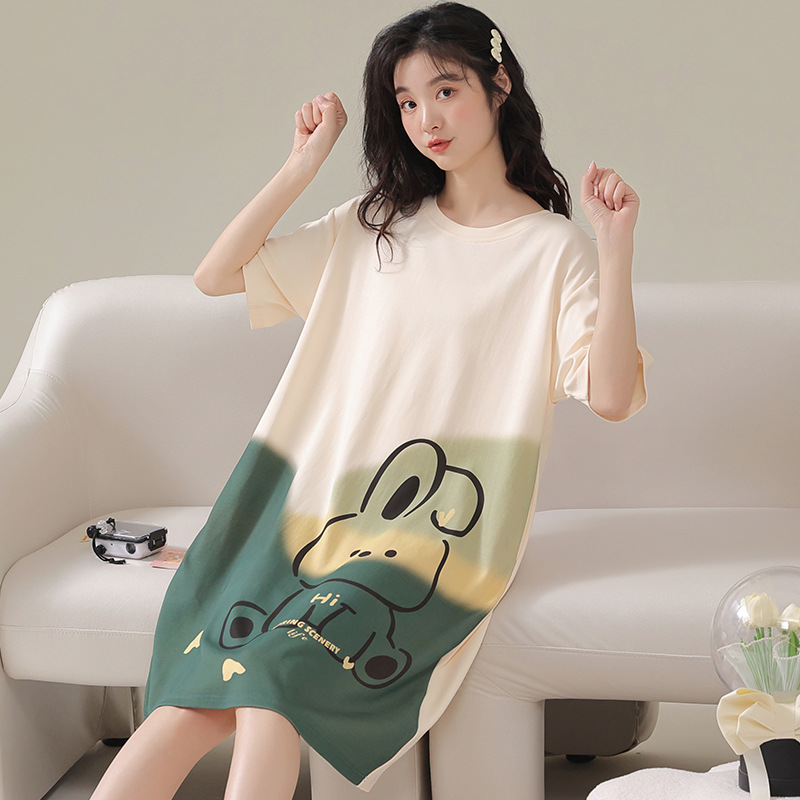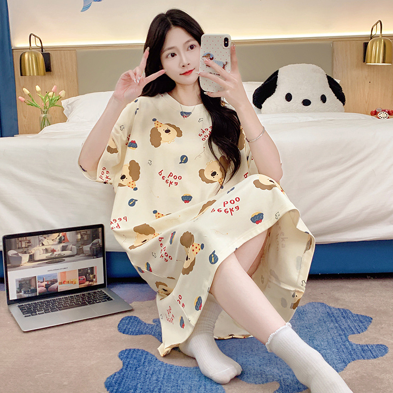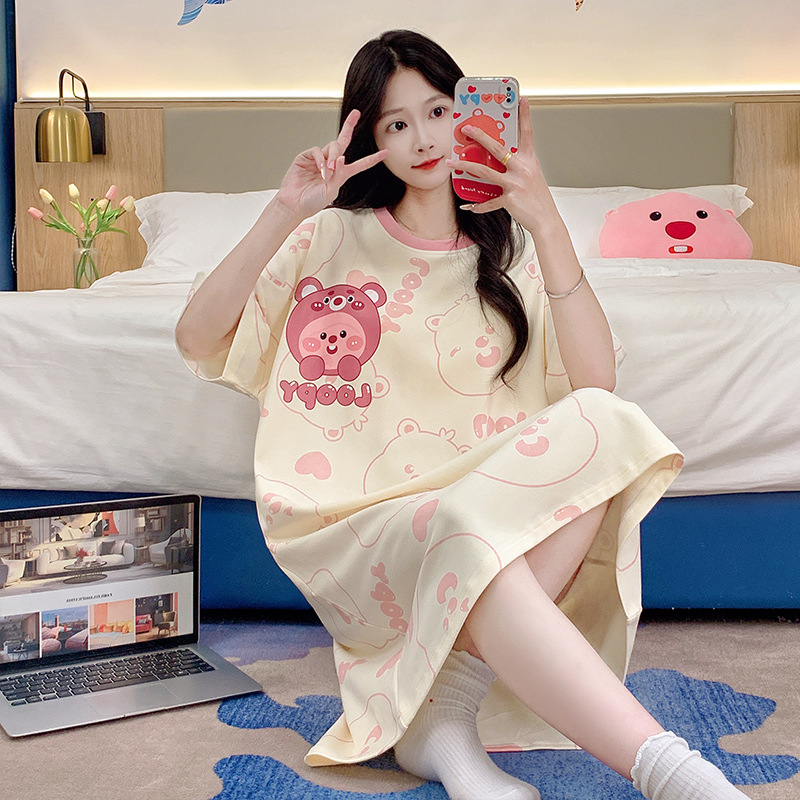 여름 새 여성 잠옷, 귀여운 반팔 잠옷, 만화 대형 여름 얇은 롱 스커트, 집 옷, 야외에서 착용 가능스토어 가기