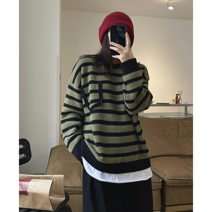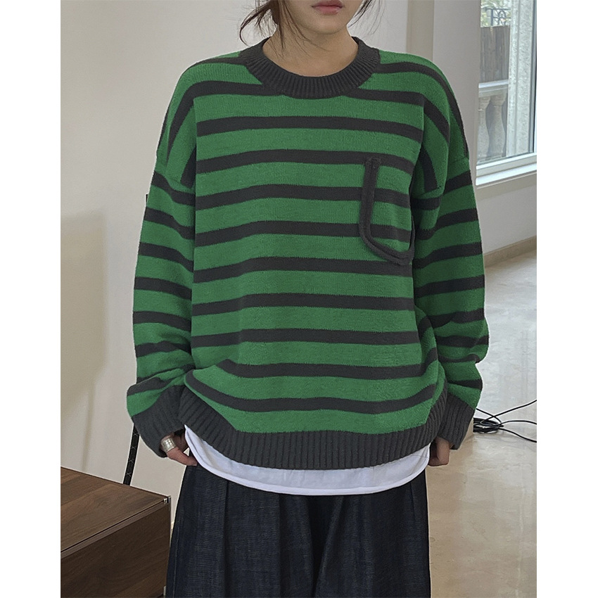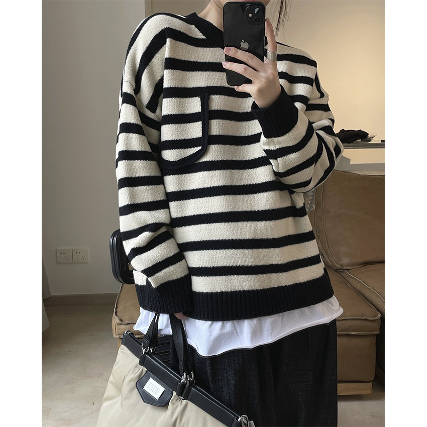 이른 봄 새로운 한국 스타일 복고풍 스트라이프 대비 색상 라운드 넥 스웨터 느슨한 캐주얼 가짜 포켓 디자인 여성을위한 니트 탑