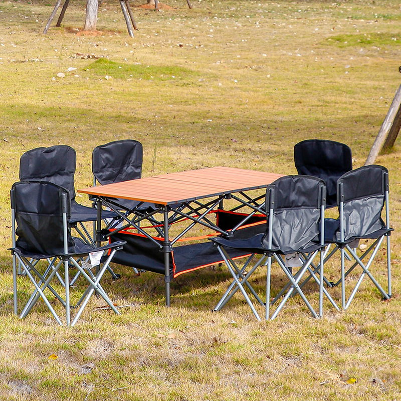 야외 접이식 테이블 7 종 세트 알루미늄 합금 우드 그레인 휴대용 계란 롤 테이블 캠핑 식탁 바베큐 테이블과 의자 세트