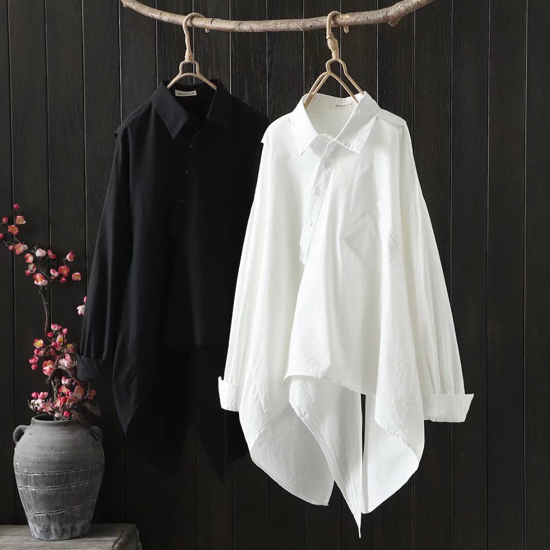 긴 소매 셔츠 봄과 가을 새로운 아티스트 스타일 불규칙한 단색 캐주얼 중간 길이 셔츠 여성의 92036