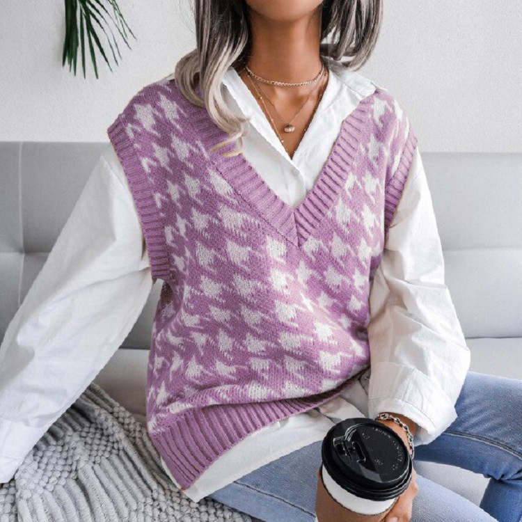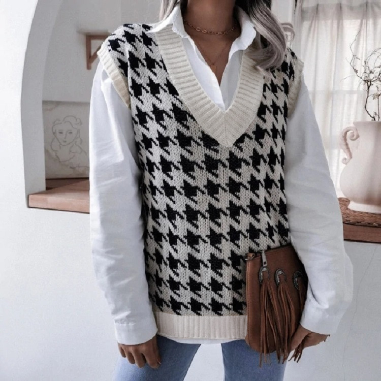 아마존 AliExpress 봄과 가을 새 스웨터 유럽과 미국 여성 캐주얼 니트 조끼 Houndstooth 탑 여성 의류
