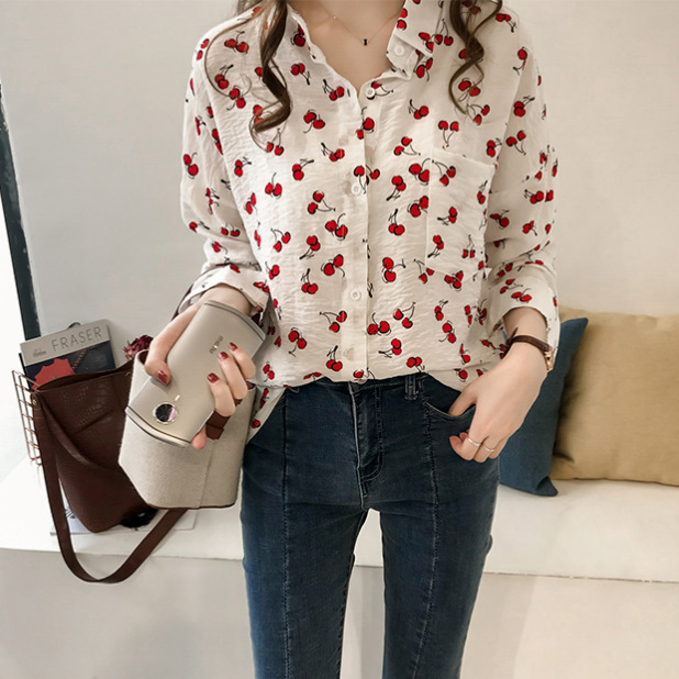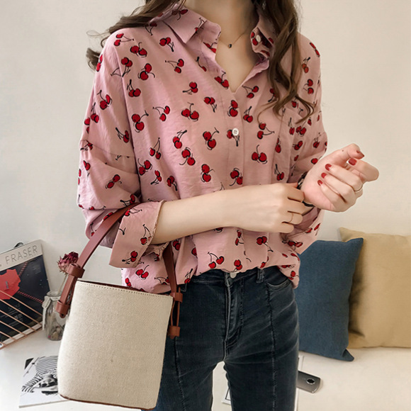 대외 무역 대형 여성 체리 프린트 긴팔 셔츠 2025 봄, 가을 새로운 루즈 셔츠 바닥 셔츠 탑스토어 가기