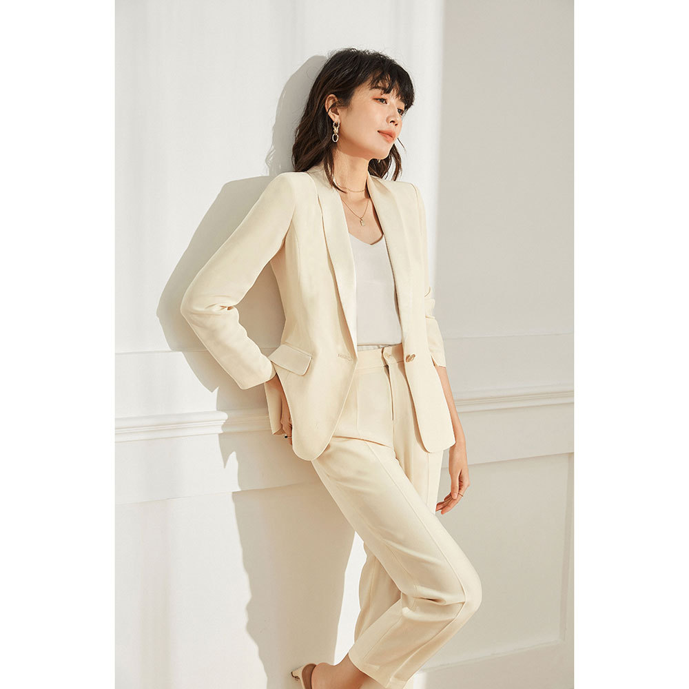 亮面的青果领是衣服zui主要的设计,一片式的裁剪,简约而优美的曲线,如丝般的光泽流光溢彩,非常具有gao级感。简约的一粒扣设计,没有拖沓感,非常精简,放在整套套装里起到一个很好的点缀效果,同时自己也是设计点之一。