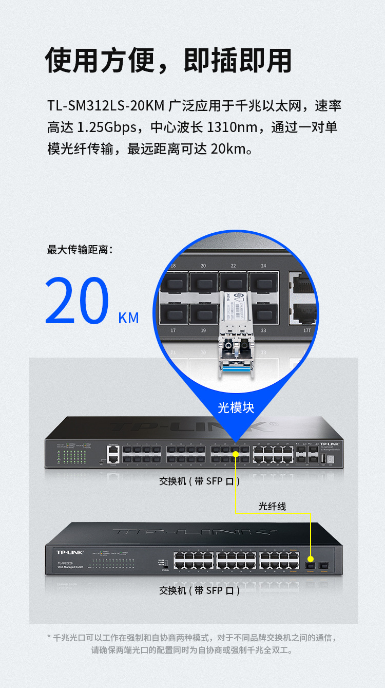 TL-SM312LS-20KM符合IEEE 802.3z协议,工作波长1310nm,即插即用无需配置。能广泛适配交换机、路由器、AP等网络设备的SFP接口,支持热插拔,安装简单,管理便捷,适用场景广。