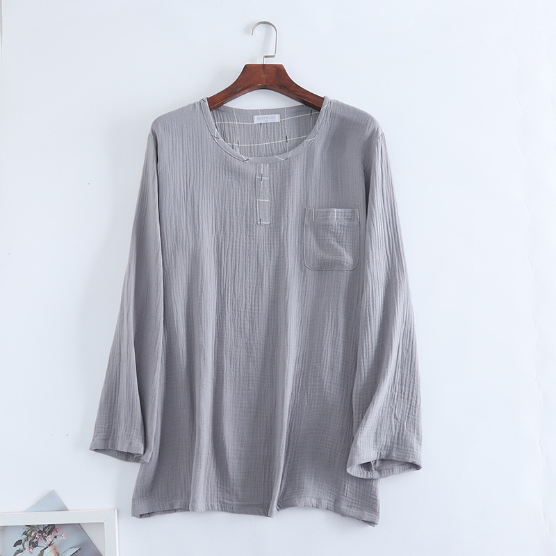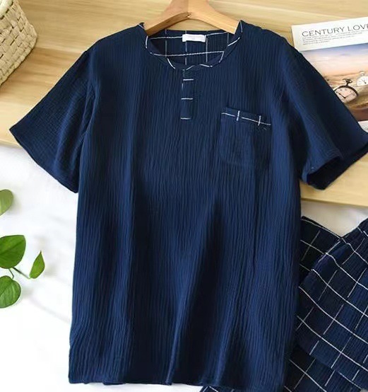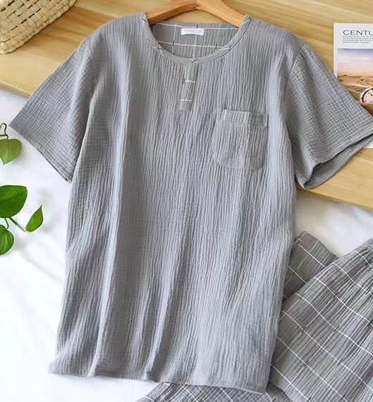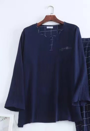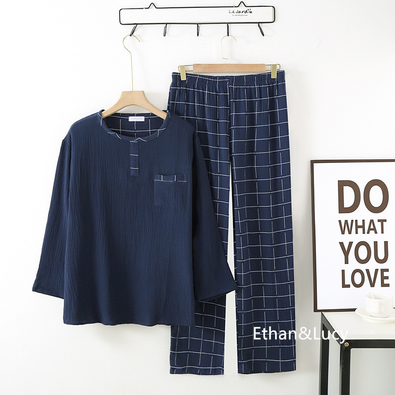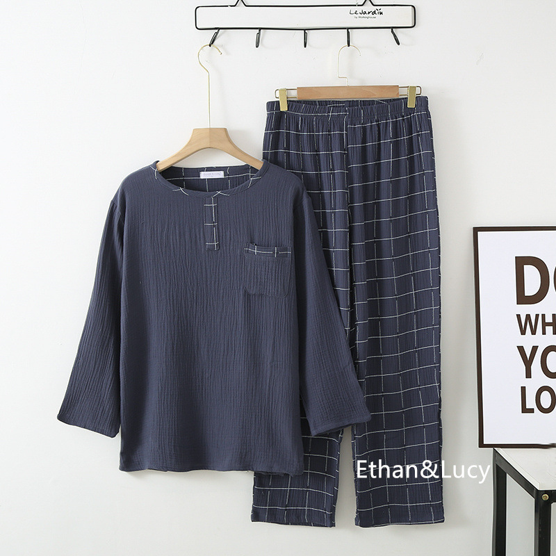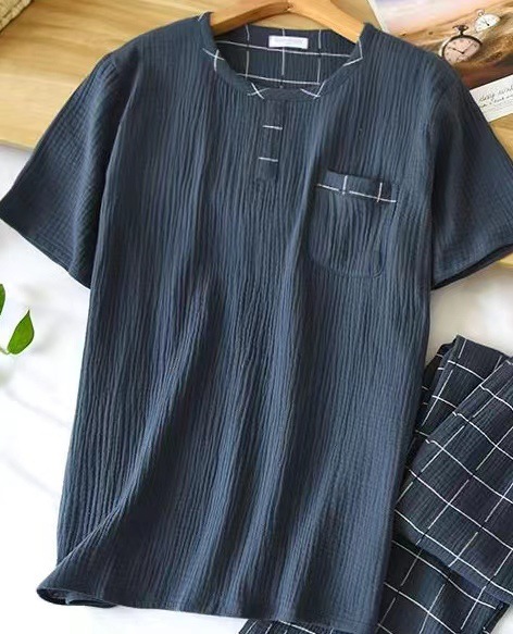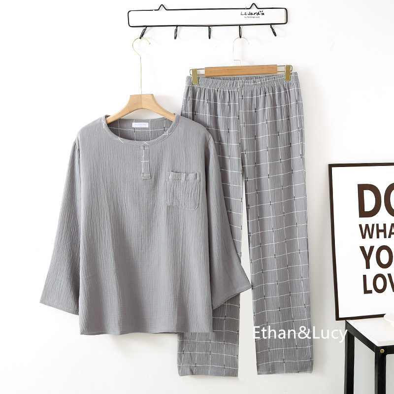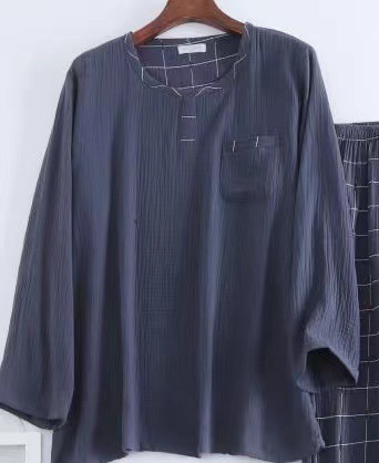 春秋新款 男士双层水洗肌理绉纱纱布(圆领格子)休闲家居服套装