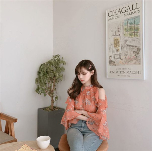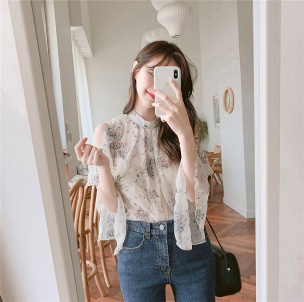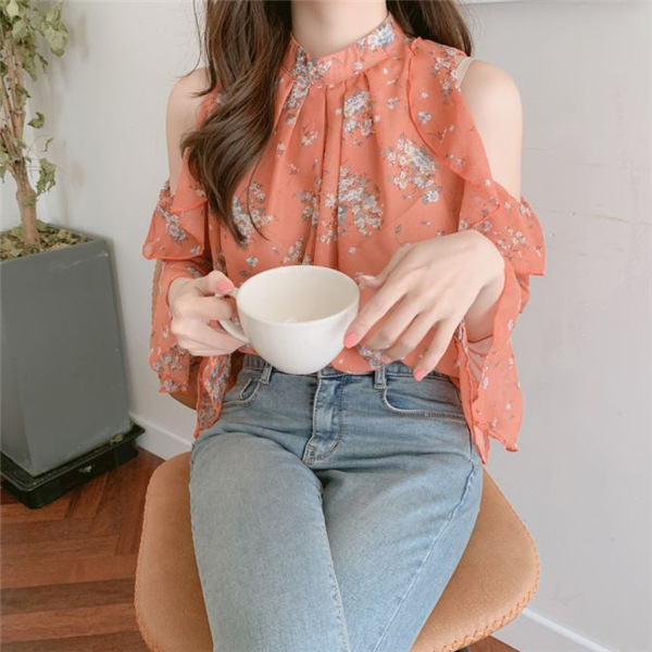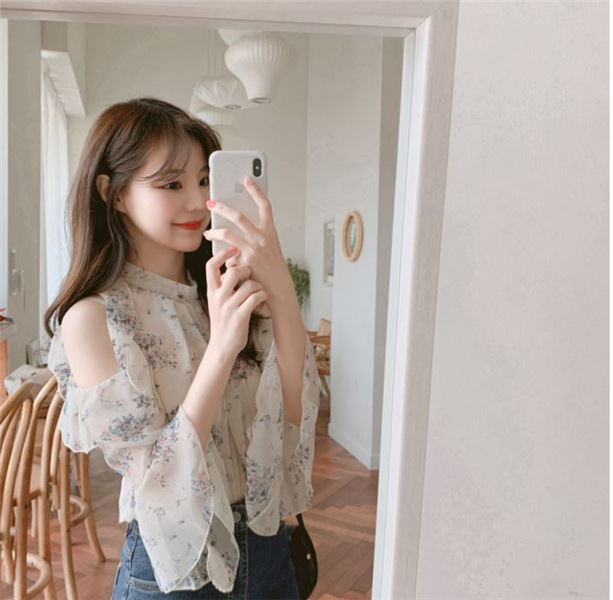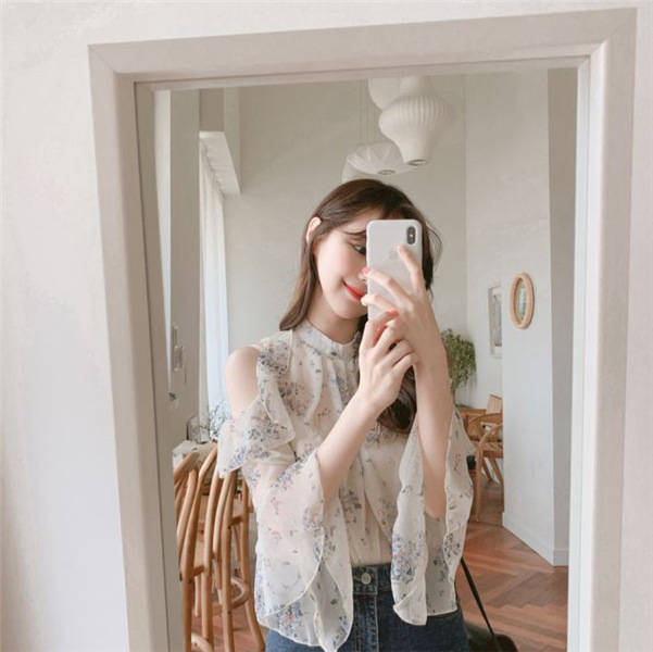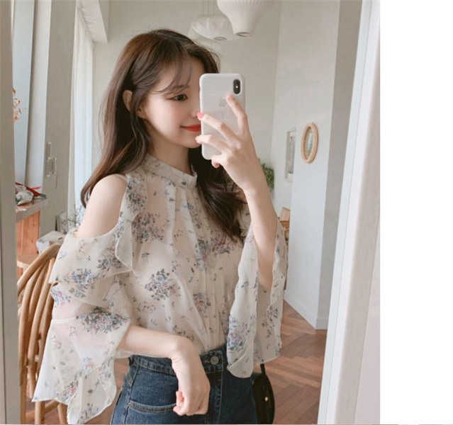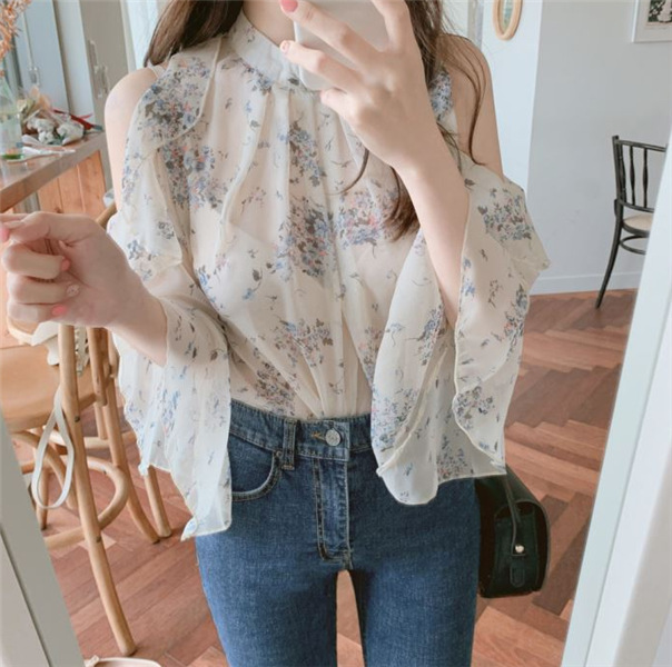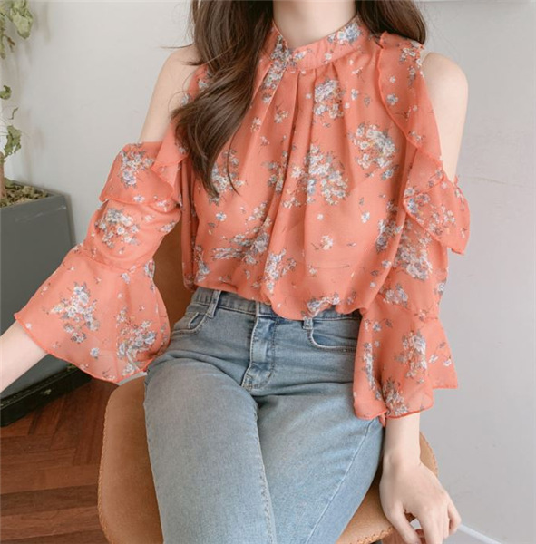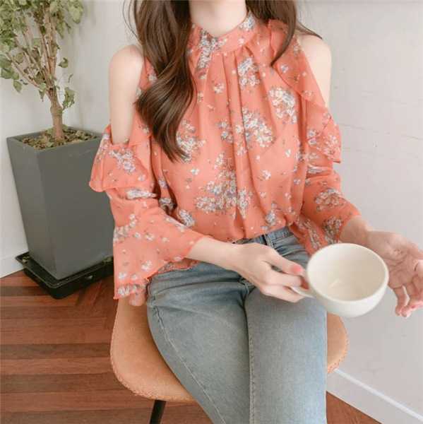 디자인 감각이 돋보이는 여성용 오프숄더 플로럴 쉬폰 셔츠, 2025년 여름 신상, 벨 슬리브 얇은 탑스토어 가기