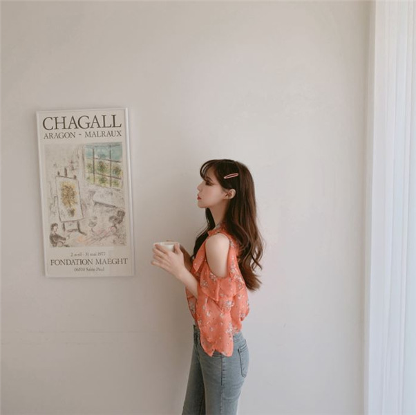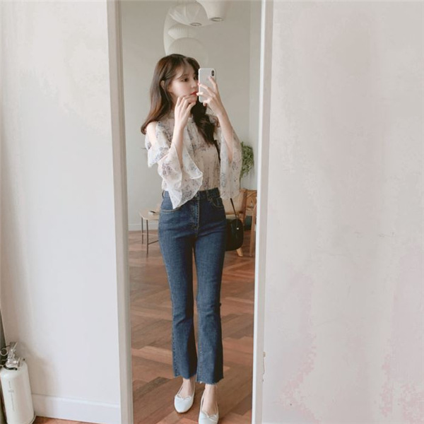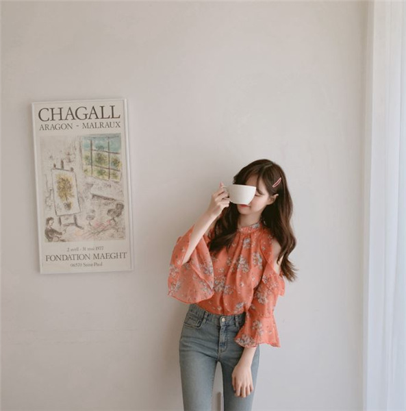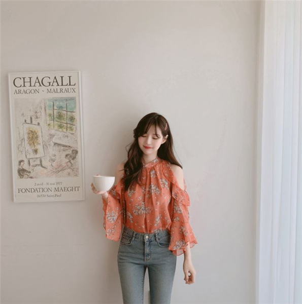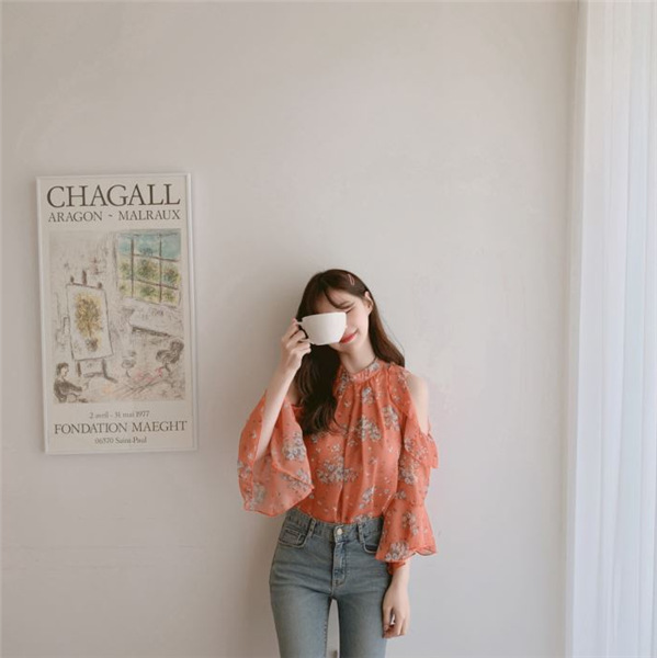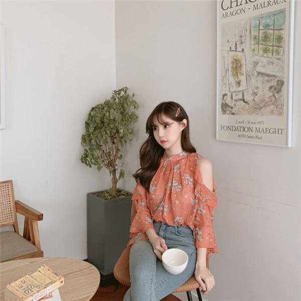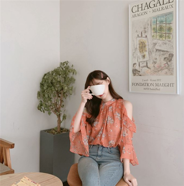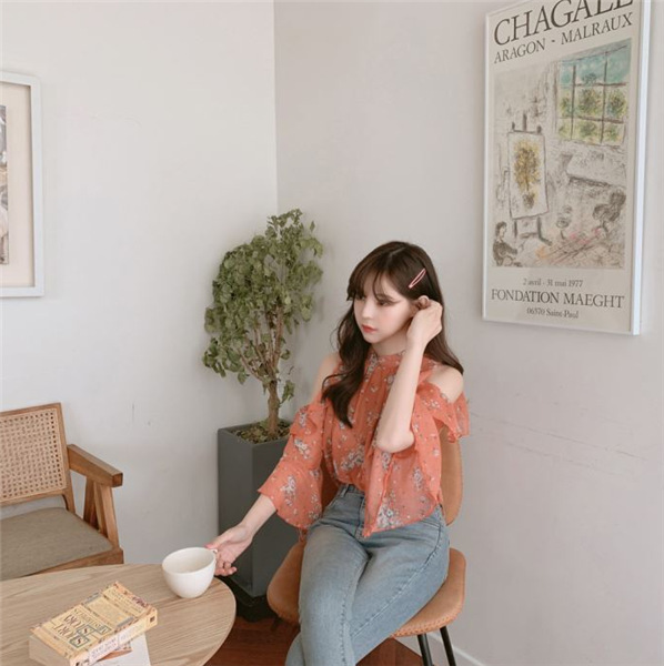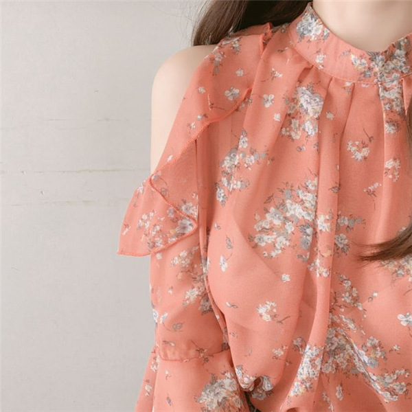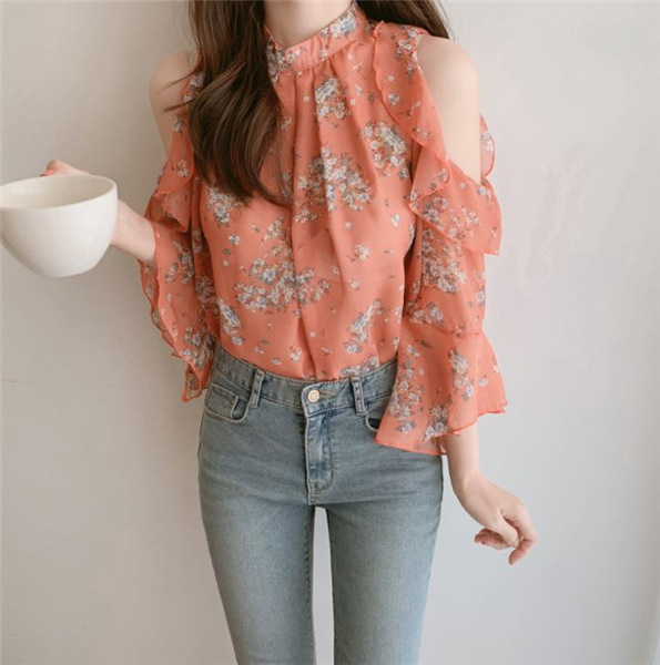 디자인 감각이 돋보이는 여성용 오프숄더 플로럴 쉬폰 셔츠, 2025년 여름 신상, 벨 슬리브 얇은 탑스토어 가기