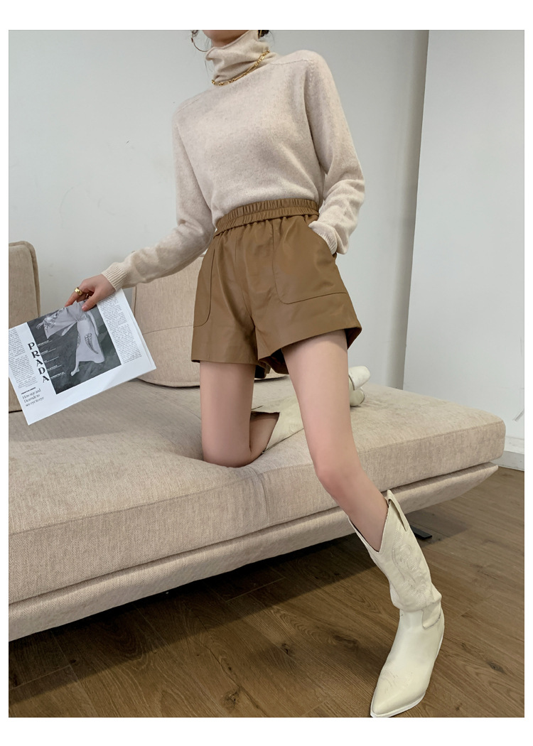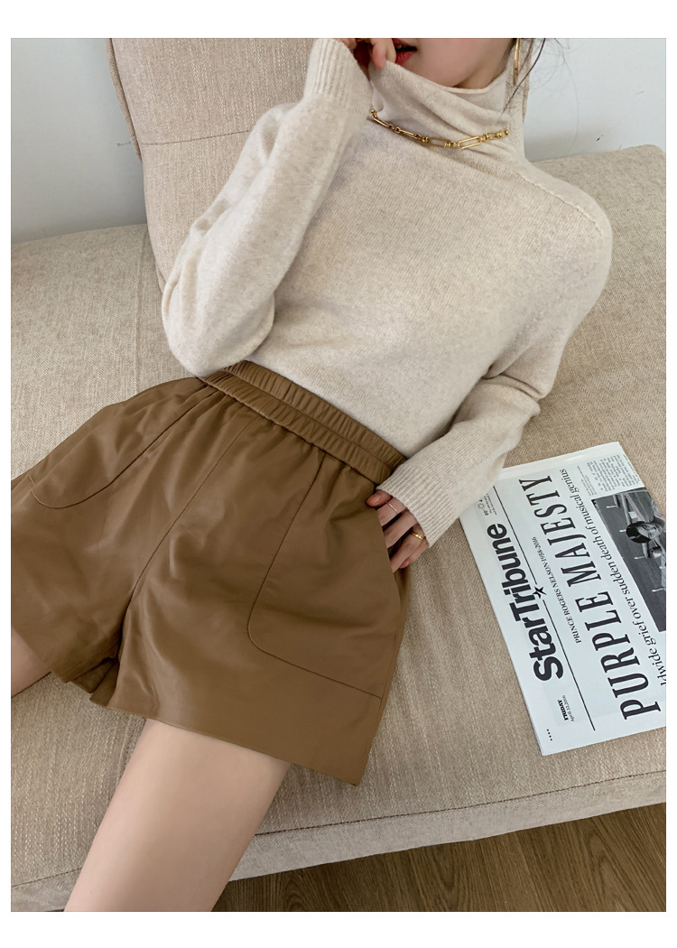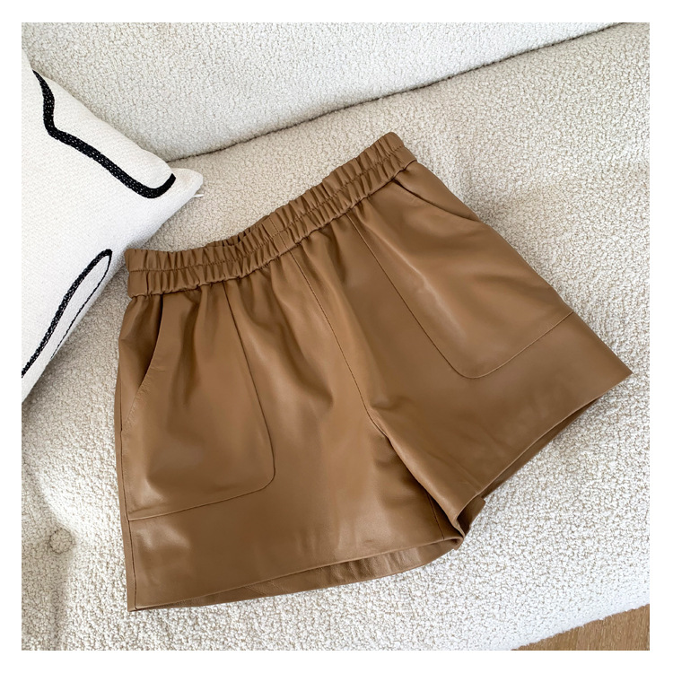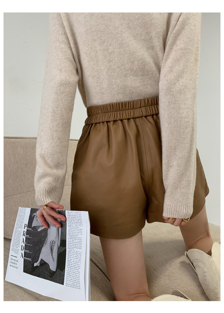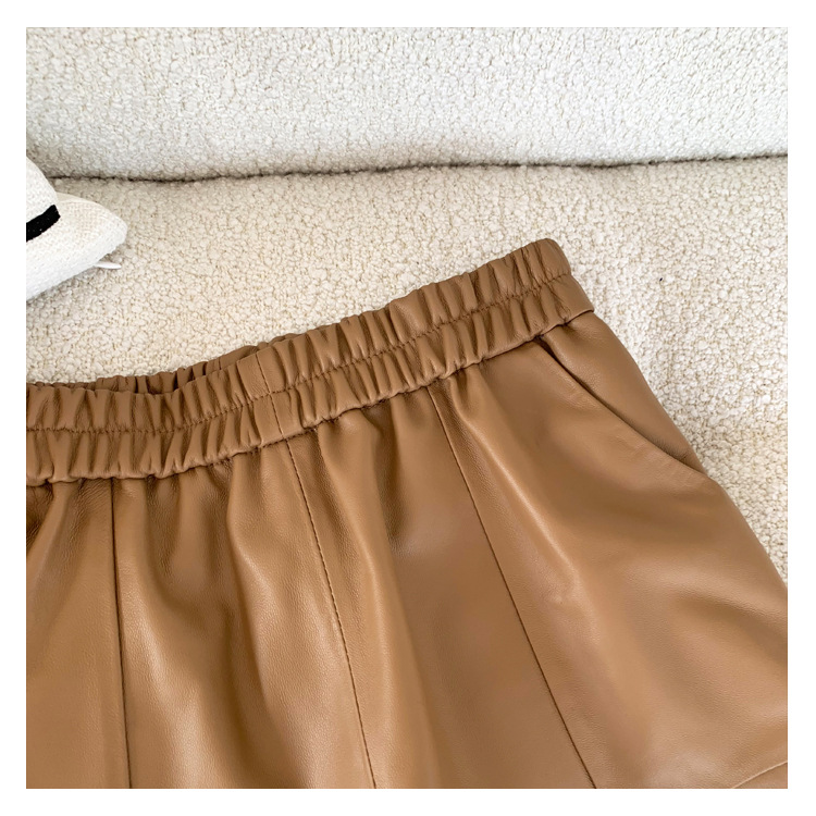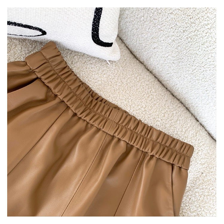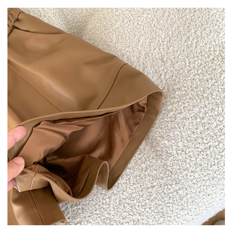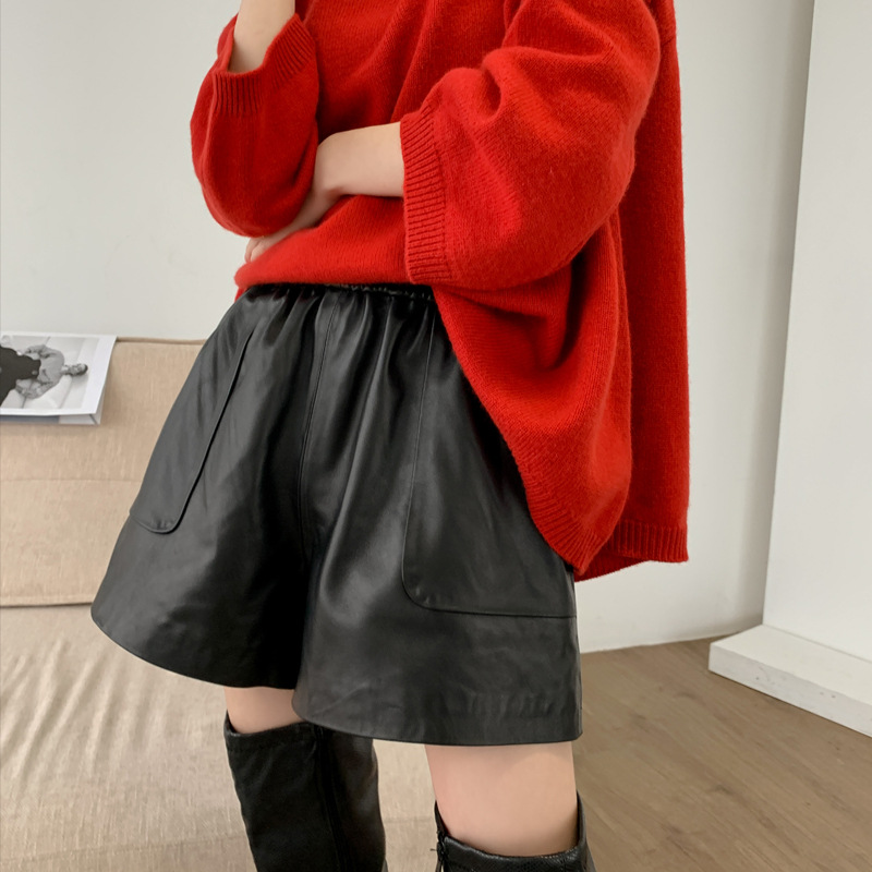 양모 가죽 바지 봄과 가을 새로운 하이 허리 탄성 허리 슬리밍 모든 매치 와이드 레그 팬츠 여성용 가죽 바지 반바지