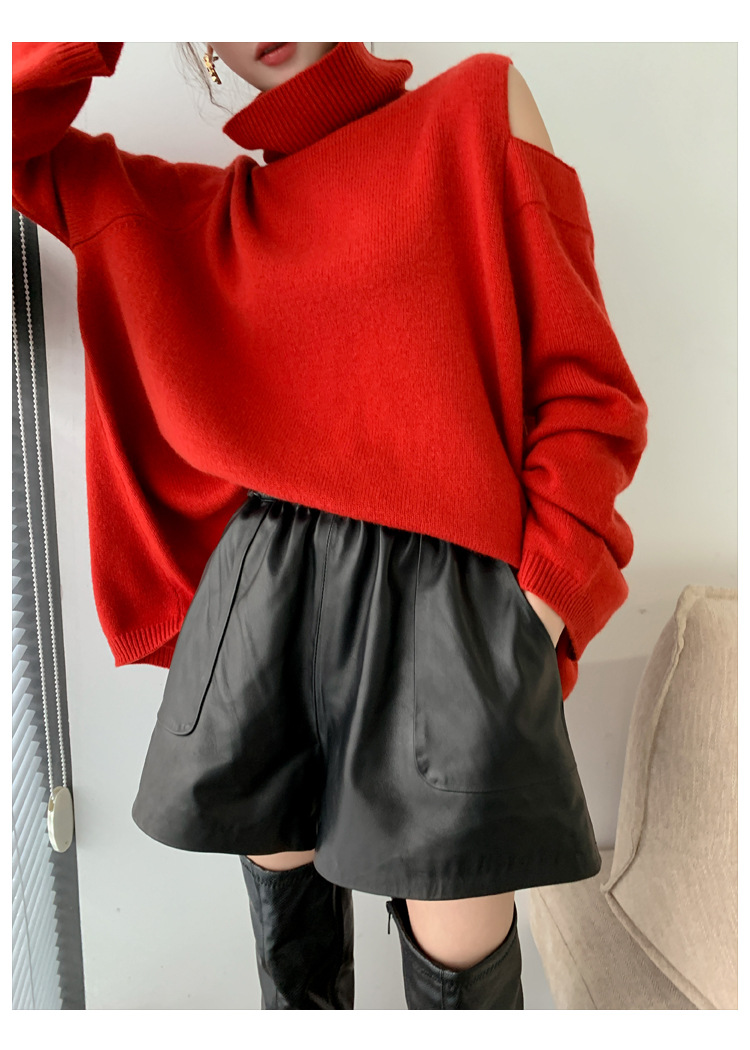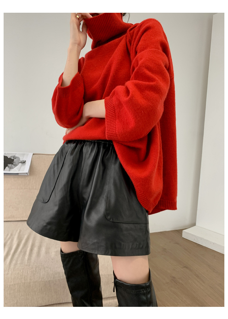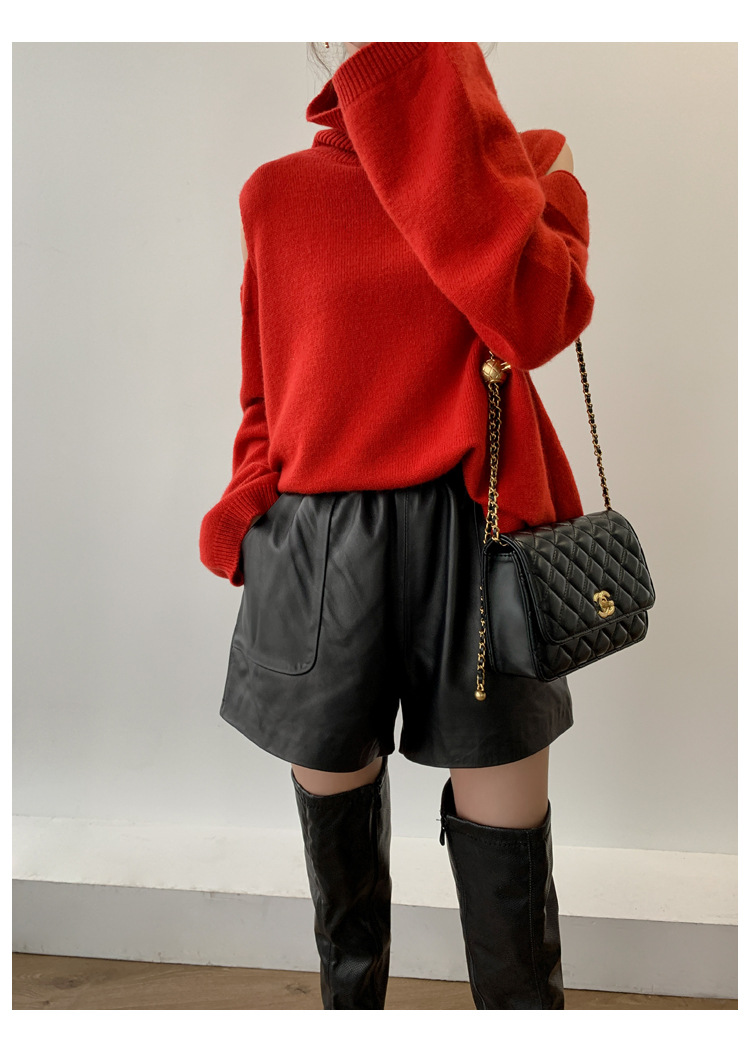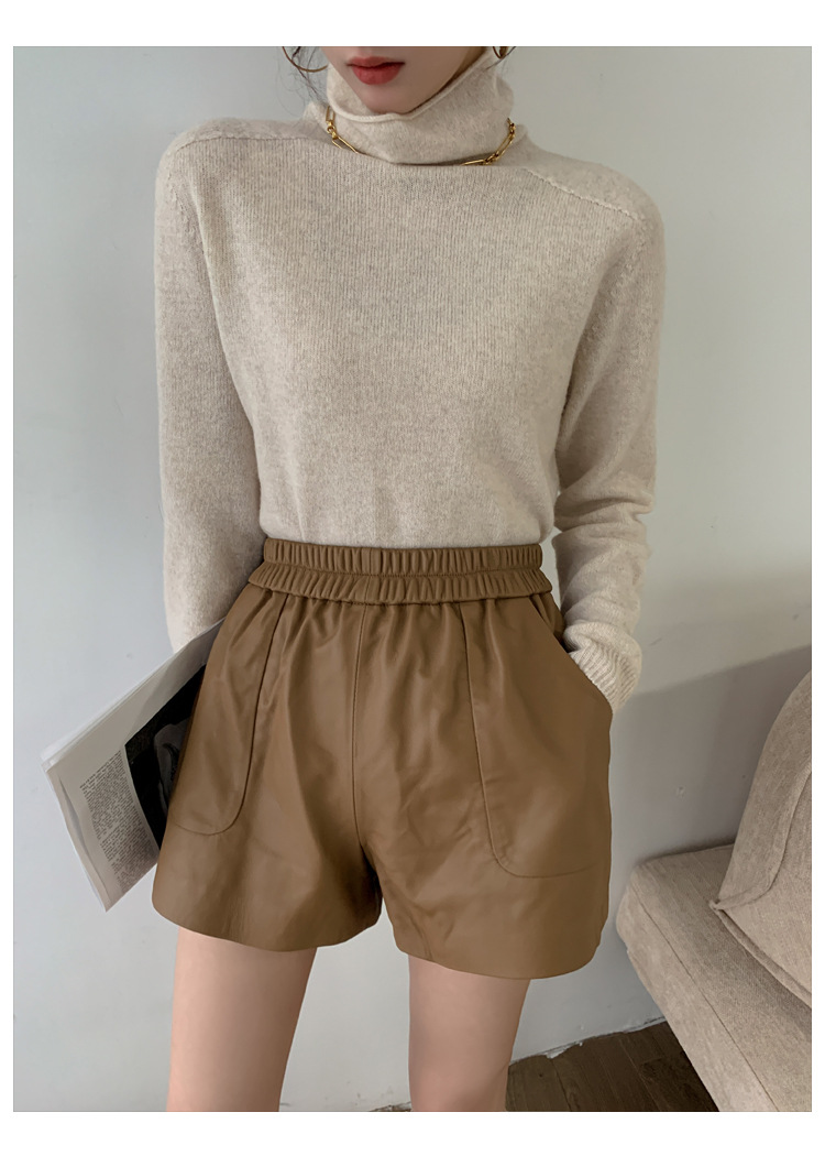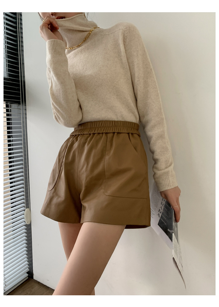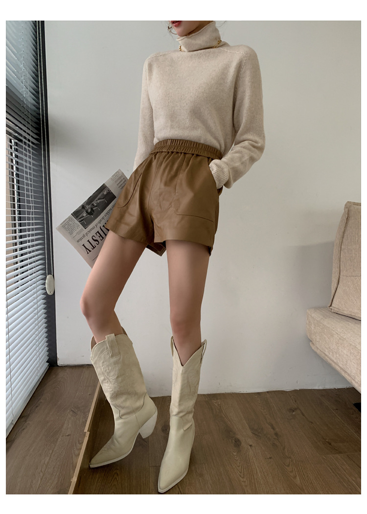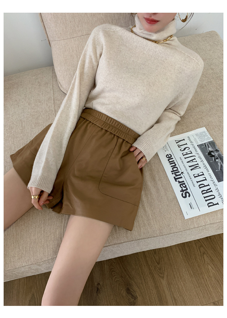 양모 가죽 바지 봄과 가을 새로운 하이 허리 탄성 허리 슬리밍 모든 매치 와이드 레그 팬츠 여성용 가죽 바지 반바지