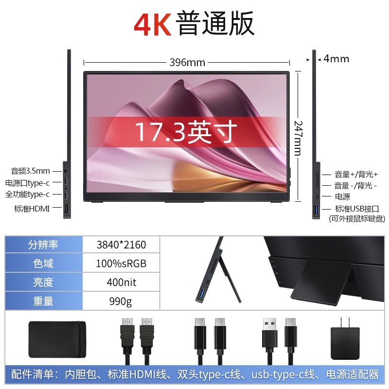 DIY定制 便携式显示器 屏幕 HDR 监视器 液晶 LG TYPE-C线接口 刷新率244Hz 17.3英寸