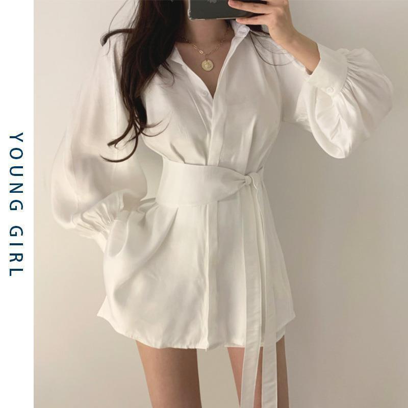 화이트 랜턴 슬리브 셔츠 반바지 여성용 투피스 세트 틈새 디자인의 여성용 2025 새로운 중간 길이 허리 셔츠스토어 가기