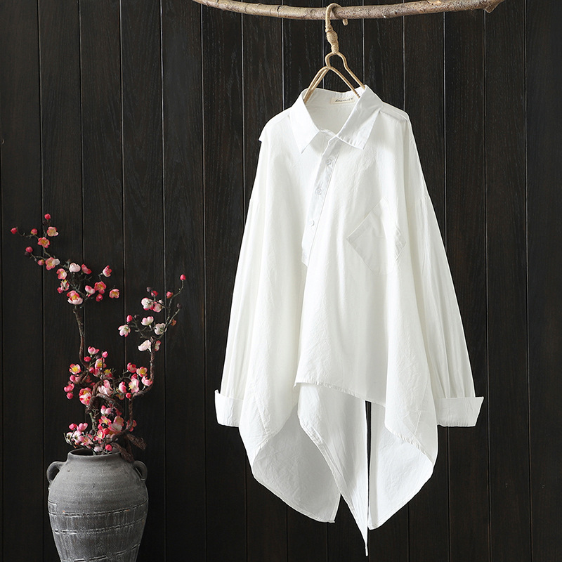 한국식 스플라이싱 루즈한 디자인 센스 중간 길이 틈새 트렌디 브이넥 셔츠 화이트 셔츠 탑 여성용 25852