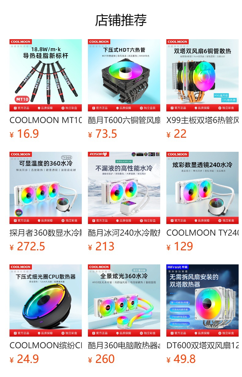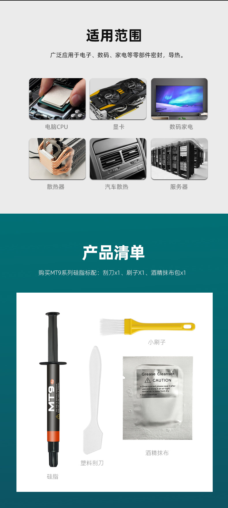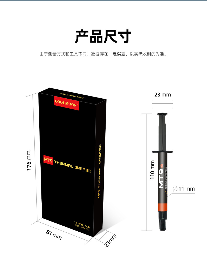 coolmoon MT9导热硅脂为跨境热销爆品,采用纳米级颗粒制作,安全不导电,导热系数为13.5W/m·k,赠送安装配件,精美彩盒包装,90pcs/box,单箱尺寸:37*35.5*26cm,8.3kg/box,支持单个采样,30天内采购金额达3000元,返还样品费用,工厂直销,大量现货供应,可提供图片包,详情请咨询客服!