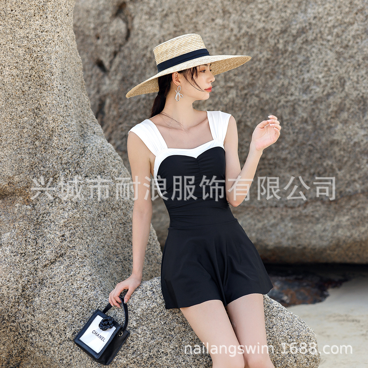 새 수영복 여성용 온천 원피스 스커트 플랫 앵글 가슴 패드 작은 가슴 개더링 등이없는 한국 인터넷 인기있는 스타일 휴가스토어 가기