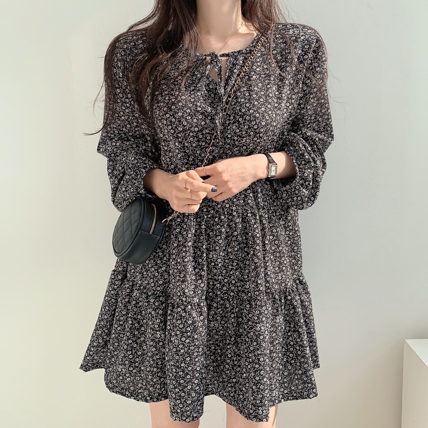 스팟 한국 동대문 2025 초가을 여성을 위한 새로운 레이스업 루즈한 꽃무늬 긴팔 드레스스토어 가기