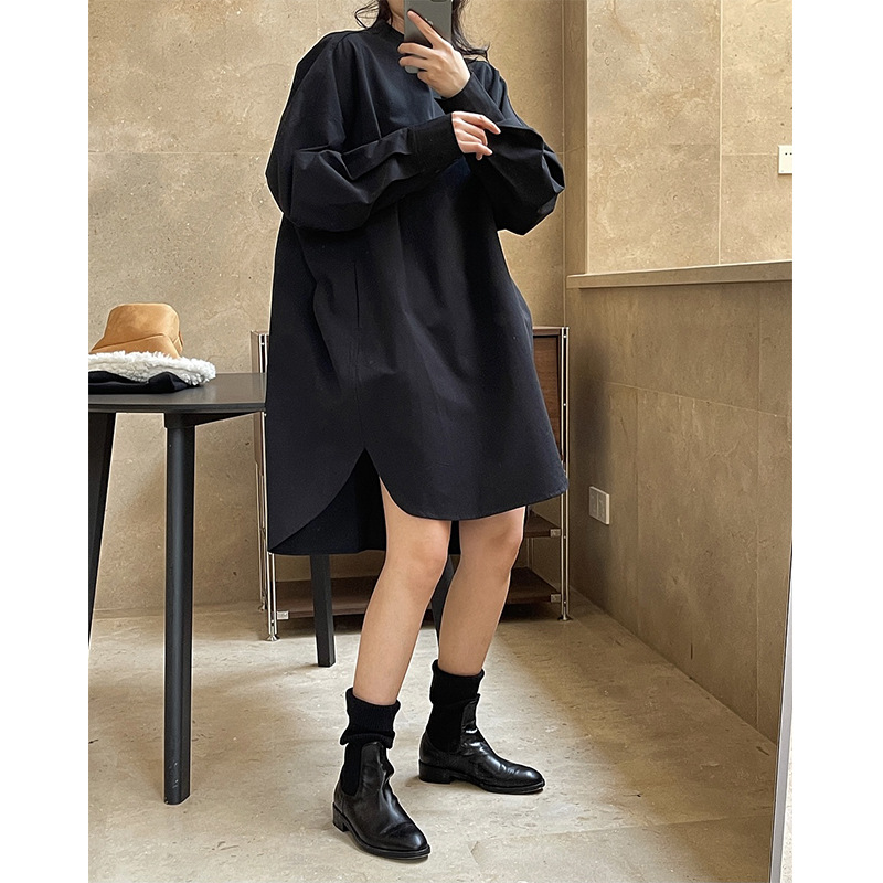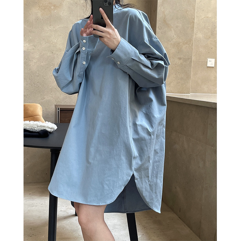 "개인" 이른 봄 새로운 한국 해산 디자인 셔츠 원피스 느슨한 슬림 라운드 넥 셔츠 원피스스토어 가기