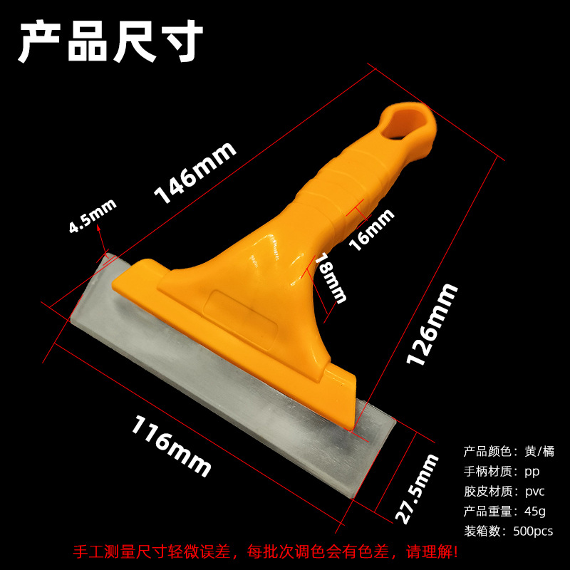 请客户下单注意,产品散装发货无独立包装,纸箱包装,运输过程会有磨损,不影响使用,介意勿拍。同时产品是偏小号刮板,颜色实拍会有色差,黄色橘色之间,介意也请慎拍,或拍前咨询客服谢谢。