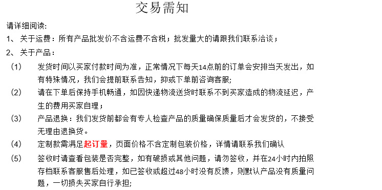 3、请在下单后保持手机畅通,如因快递物流送货时联系不到买家造成的物流延迟。
