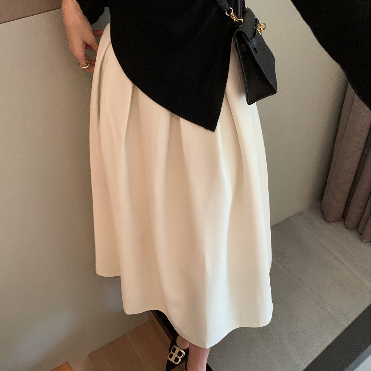 봄 중간 길이의 팝 스커트 여자 2024 한국식 하이 허리 느슨한 슬리밍 주름 스커트 좋은 문자 A 라인 스커트