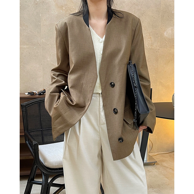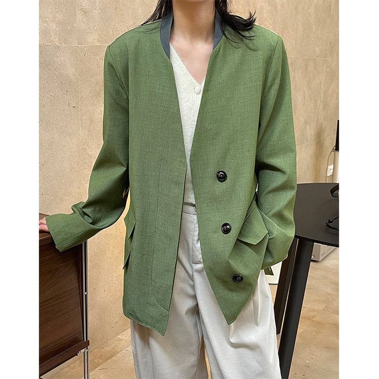 "개인" 봄 새로운 디자이너 스타일 복고풍 대비 컬러 넥 라인 세트 느슨한 슬림 캐주얼 재킷 여성스토어 가기
