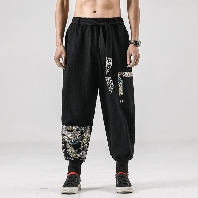 2021 가을 새로운 복고풍 중국 스타일 캐주얼 바지 남자의 유행 자수 벨트 느슨한 코튼 린넨 남성 블루머