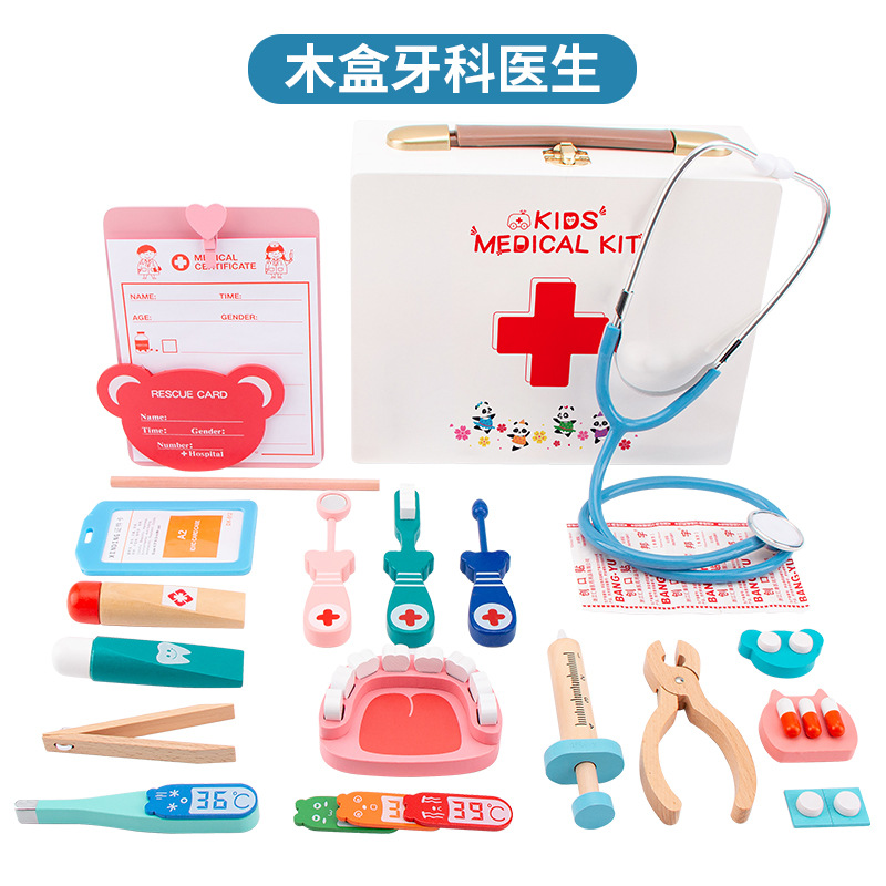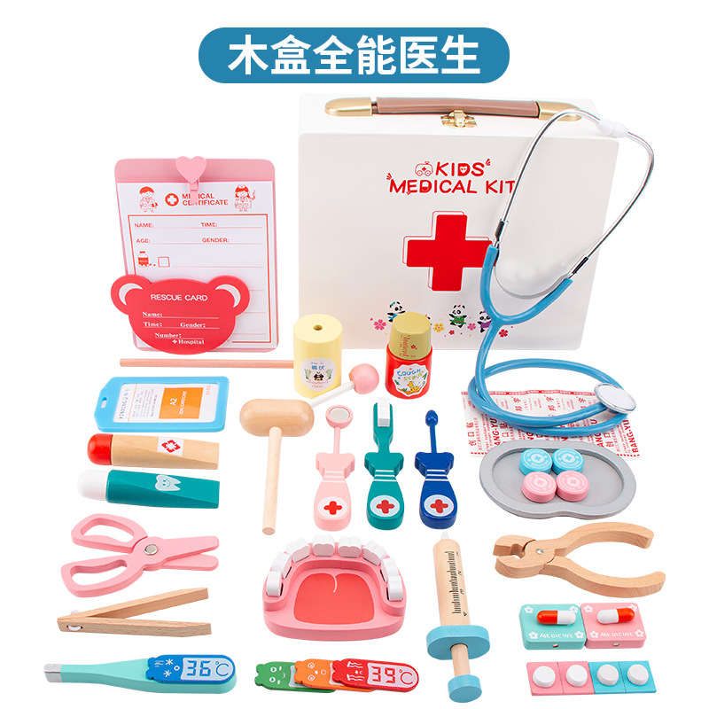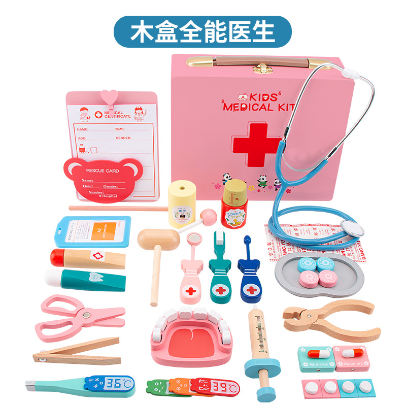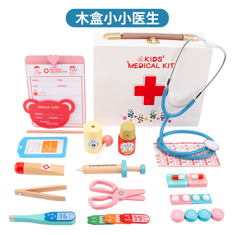 가족 나무 상자 작은 의사 간호사 주사 의료 도구 응급 처치 약 상자 나무 장난감 소년과 소녀스토어 가기