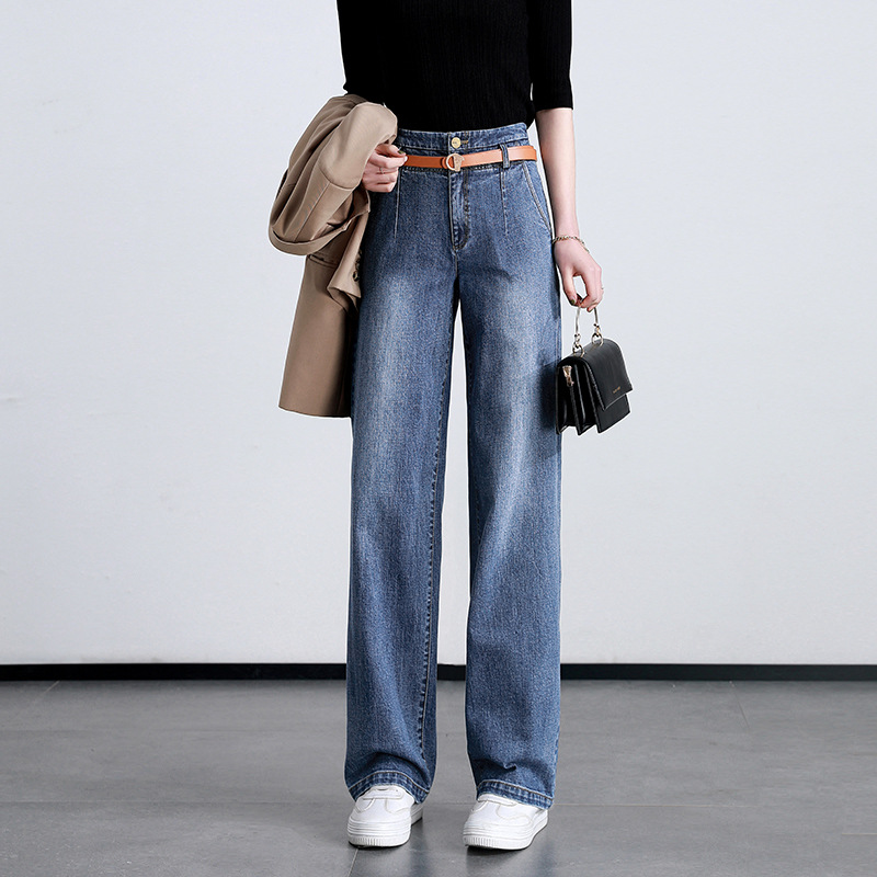 클리어런스 세일 여성용 워싱 진 2025 가을 신상 더블 허리밴드 한국 스타일 하이웨이스트 와이드 레그 바닥 길이 팬츠 9281