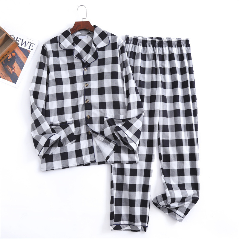 秋冬季新款 男款棉质磨毛绒布格子开衫长袖长裤睡衣套装