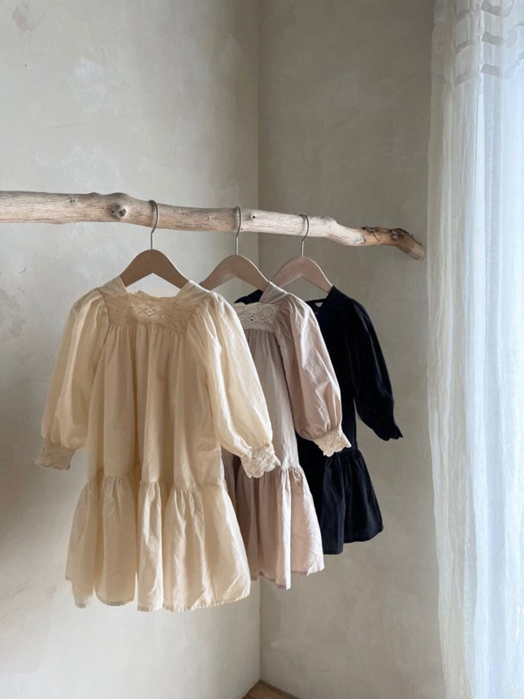 여자 기질 레이스 칼라 퍼프 슬리브 드레스 한국 아동 의류 가을 공주 드레스 아기 소녀 가을 긴 드레스
