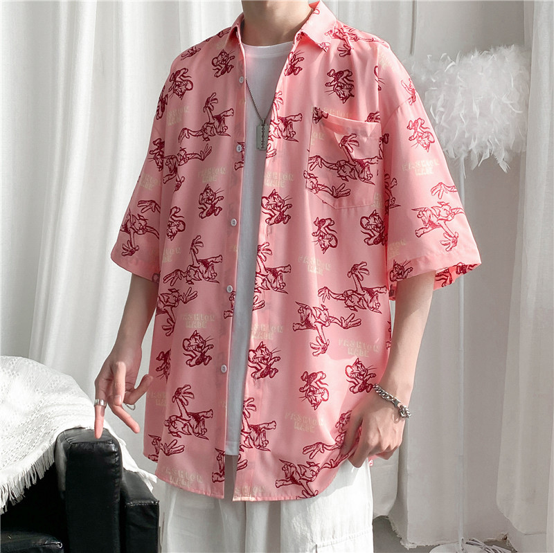 반팔 셔츠 남성용 컬리지 스타일 만화 캐릭터 탑 한국 스타일 트렌디 만능 아이템 인스 홍콩 스타일 일본 스타일 루즈핏 여름 셔츠