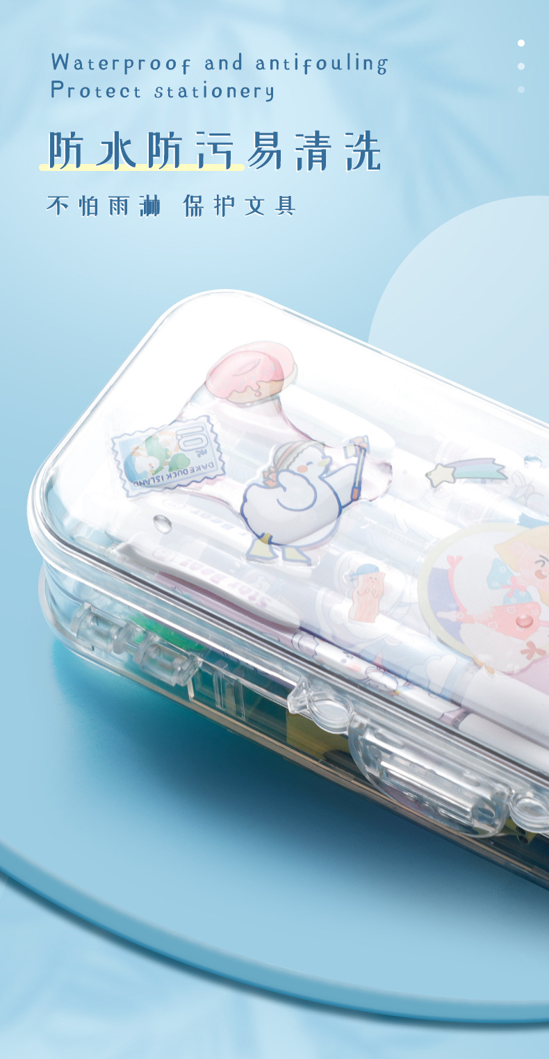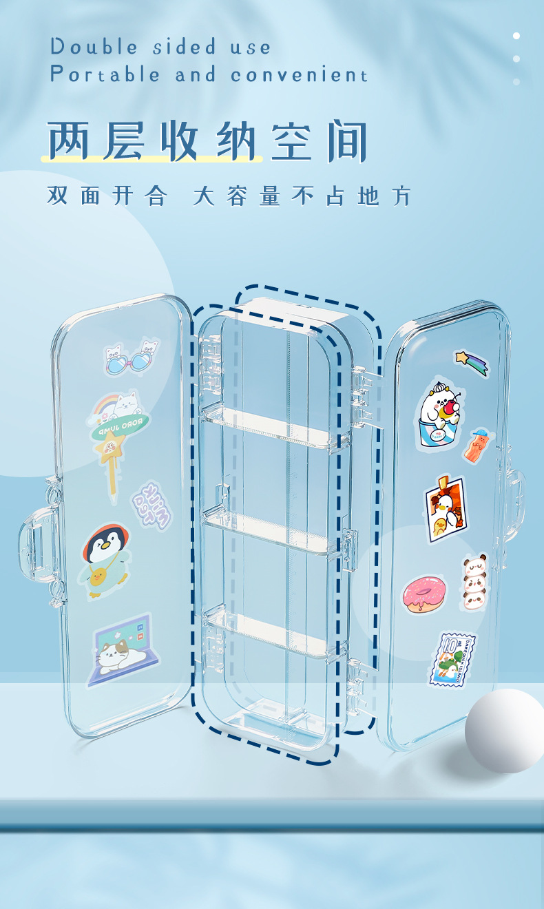 双层透明笔盒是PET材质 ,表面平滑有光泽,耐摩擦和尺寸稳定性好,磨耗小而硬度高,而且非常耐摔。适合平面UV打印图案.